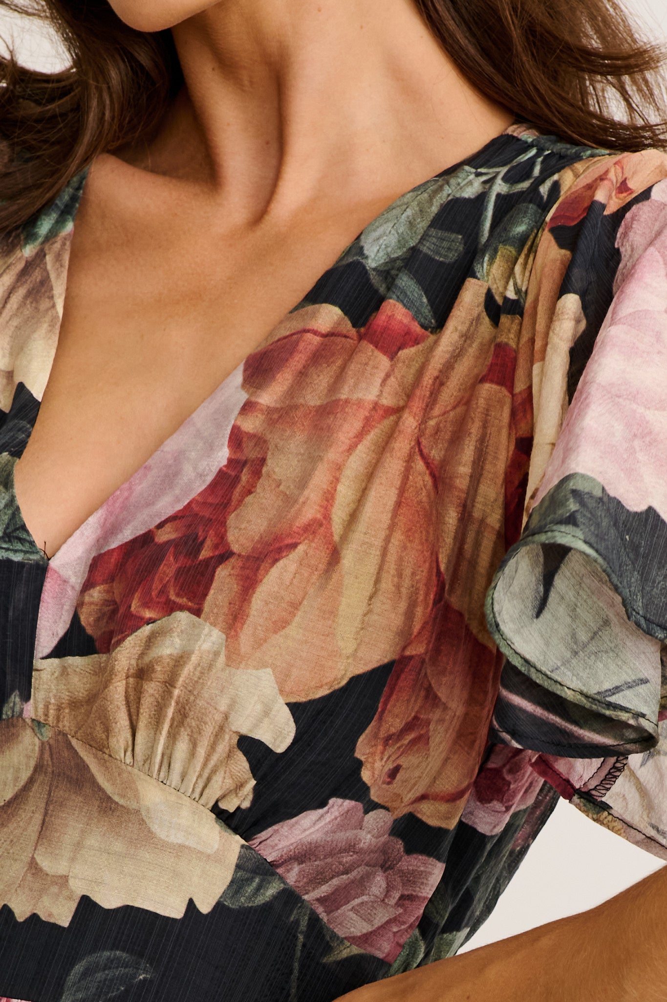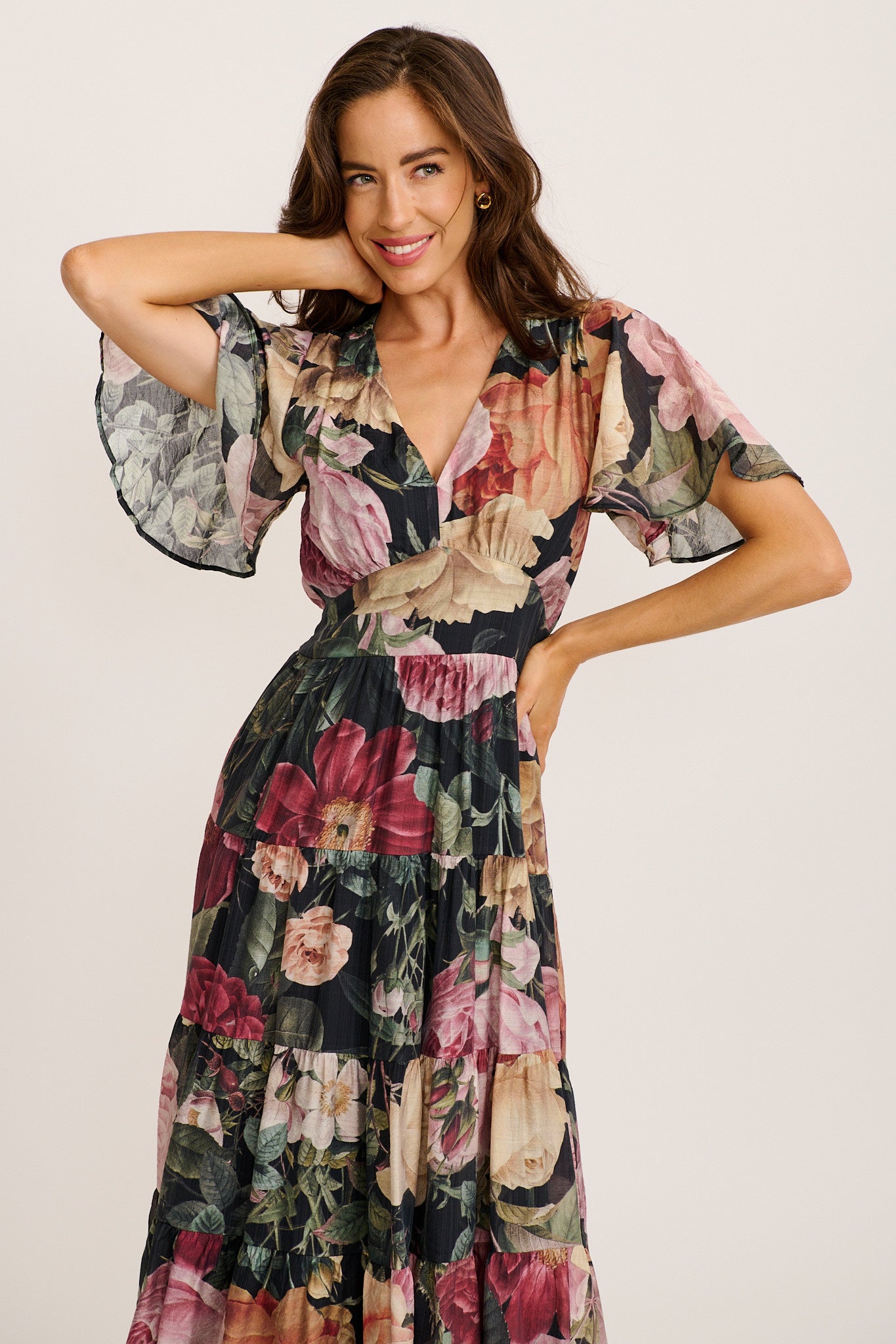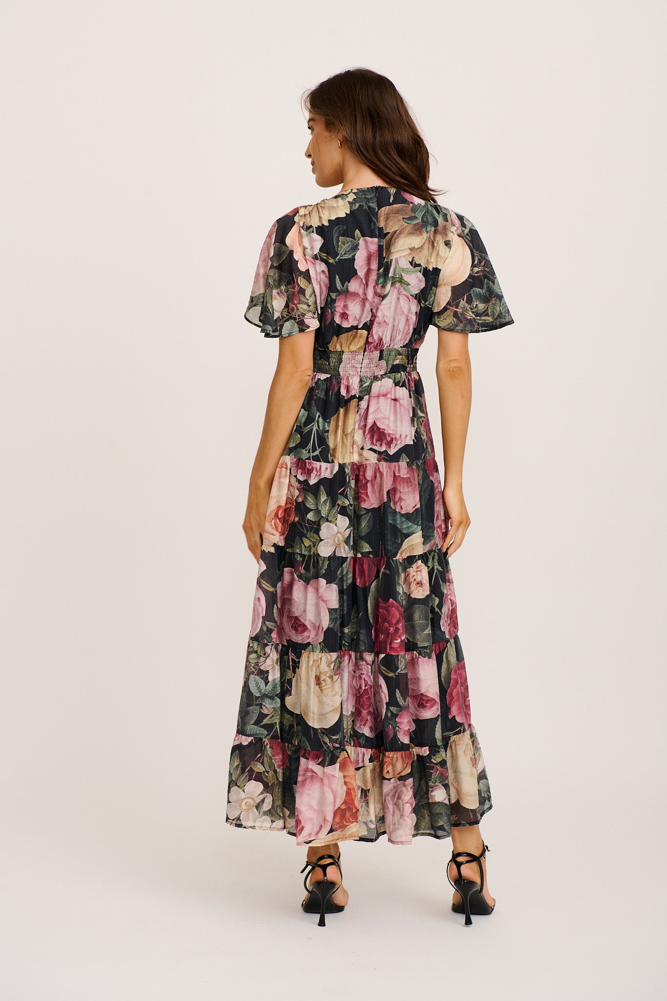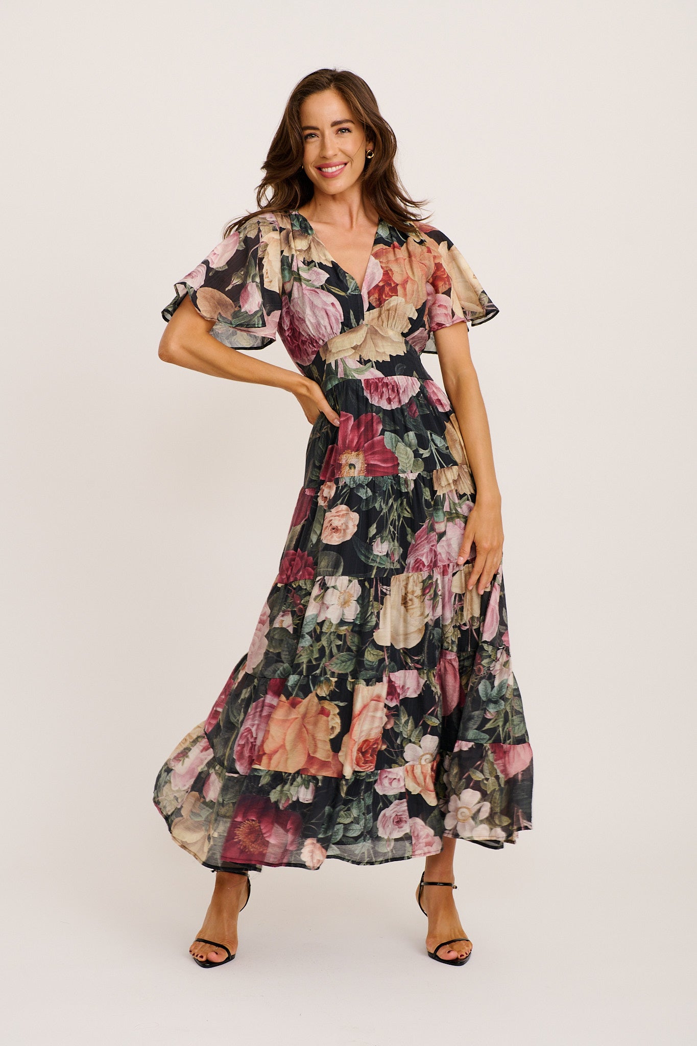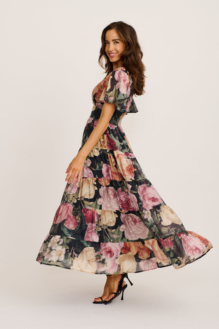 Pastel Symphony Maxi Dress in Black with Multi Floral Print