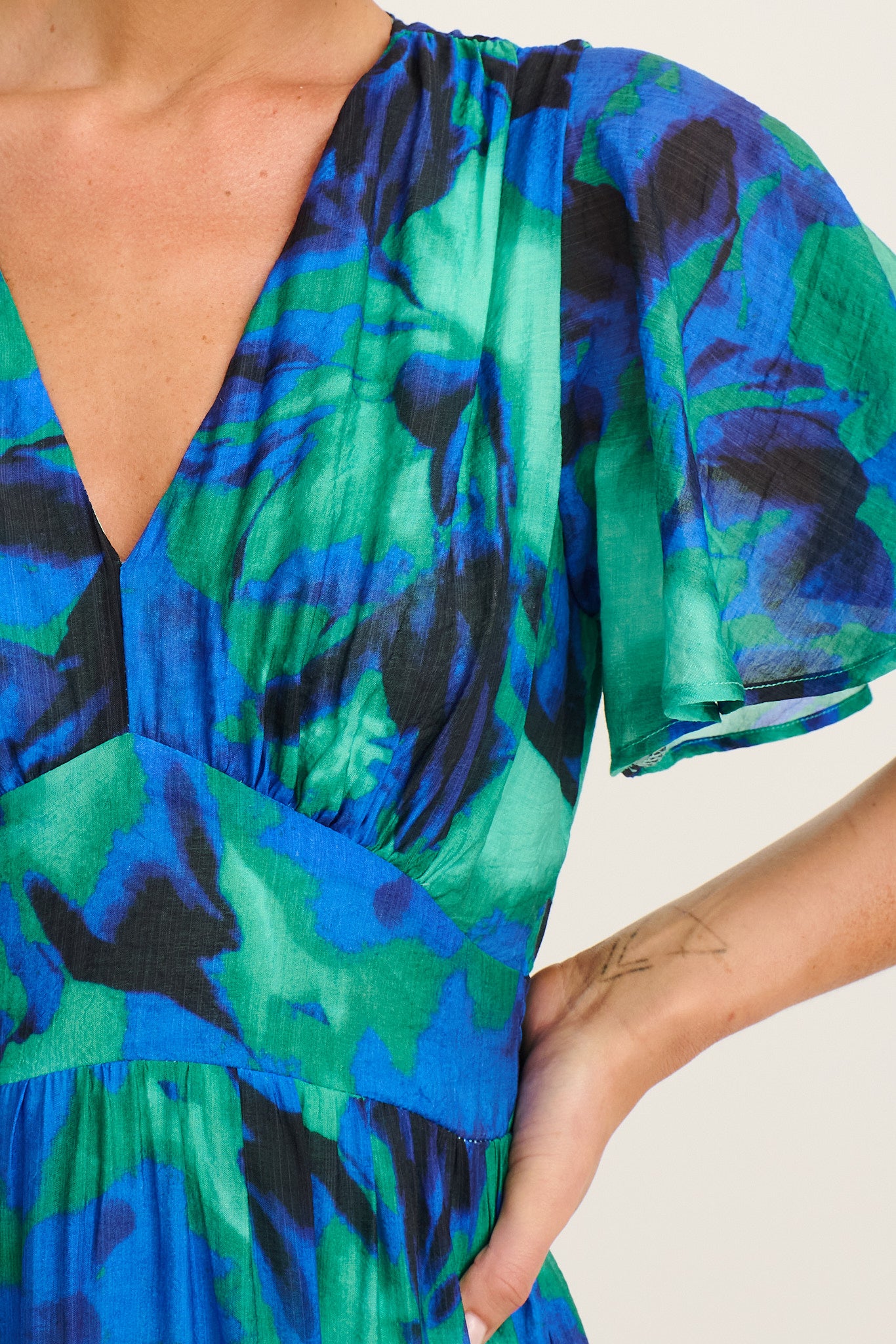 Made from lightweight viscose‑nylon, this dress feels soft and breathable on warmer days. A flattering V neckline opens into a shirred back waist that creates gentle shape, while flutter sleeves add delicate movement. The tiered skirt flows fluidly with each step, enhancing the elegant silhouette.