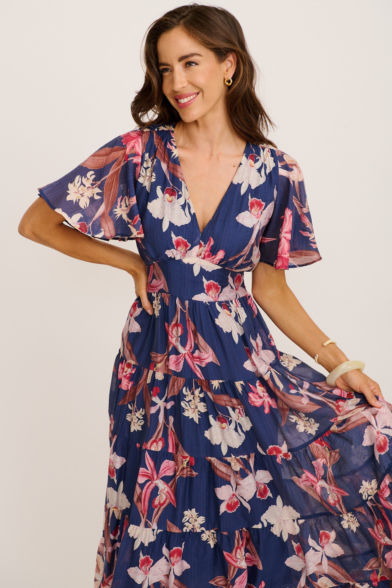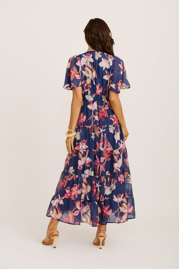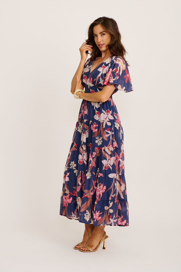 The Pastel Symphony Maxi Dress in Navy Multi Floral is a truly elevated piece, designed to make every moment feel exceptional. Its rich navy base and harmonious floral palette bring statement style with thoughtful refinement. This dress is equally at home at wedding receptions, sunset dinners or destination soirées.