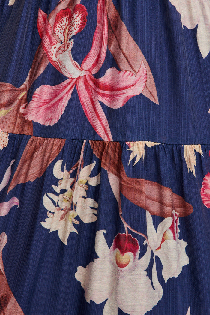 Cut in a breathable viscose‑nylon blend, the silhouette is both structured and fluid. A shirred back waist gently contours the figure, while the tiered skirt sways with graceful movement. The lined bodice and skirt lend a refined finish, and the V neckline frames the face beautifully, making it a timeless seasonal favourite.