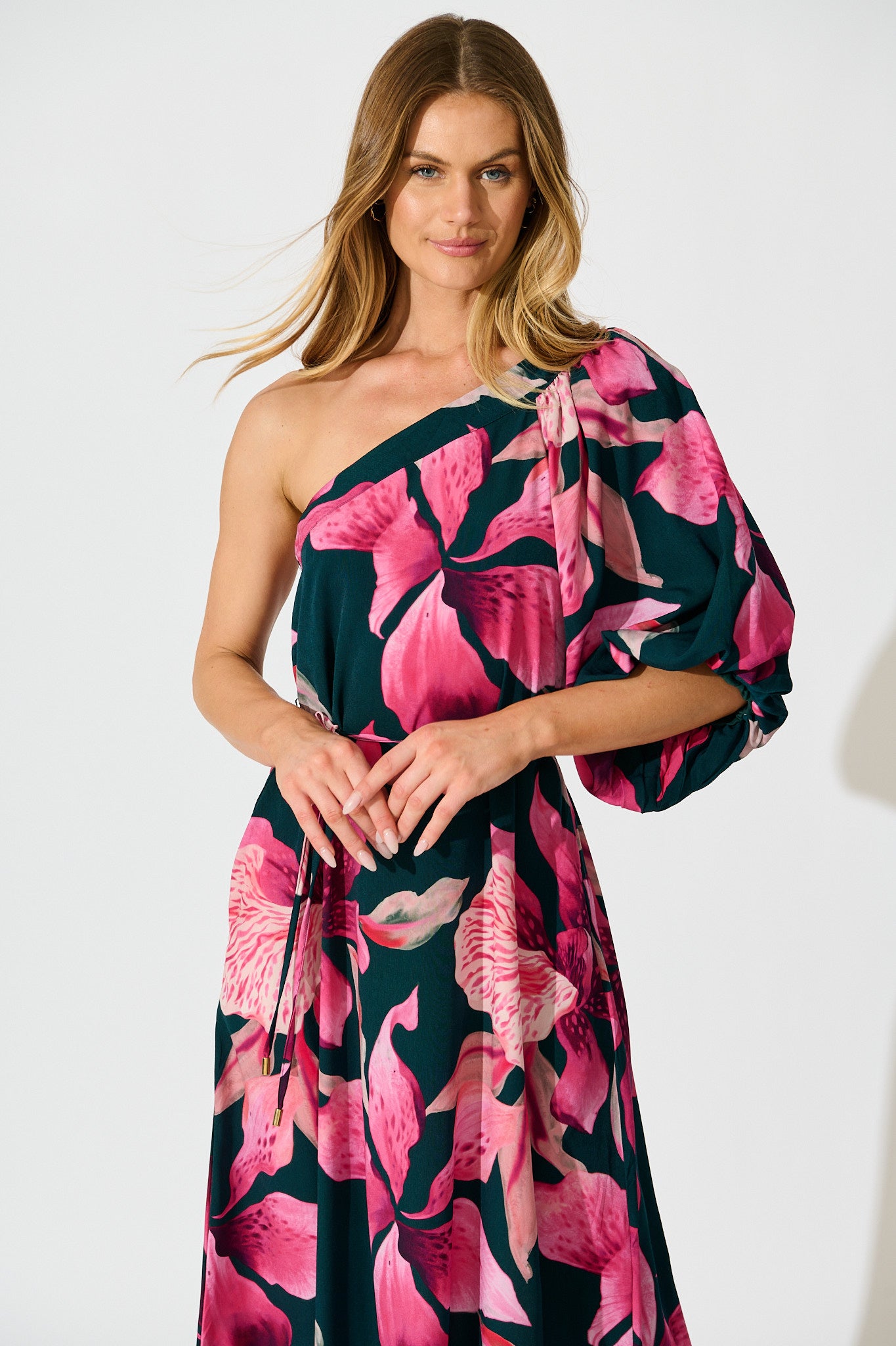 Petal Rhapsody Maxi Dress in Emerald with Pink Floral