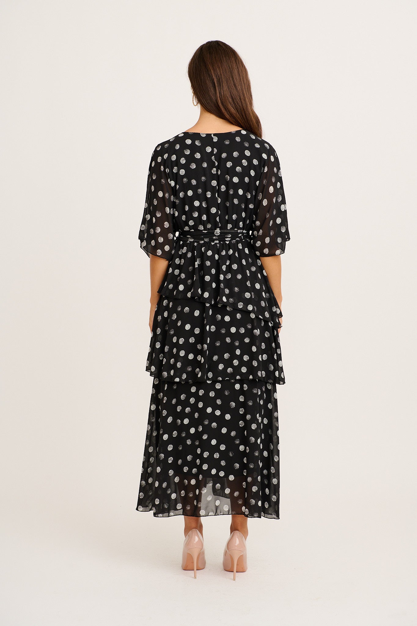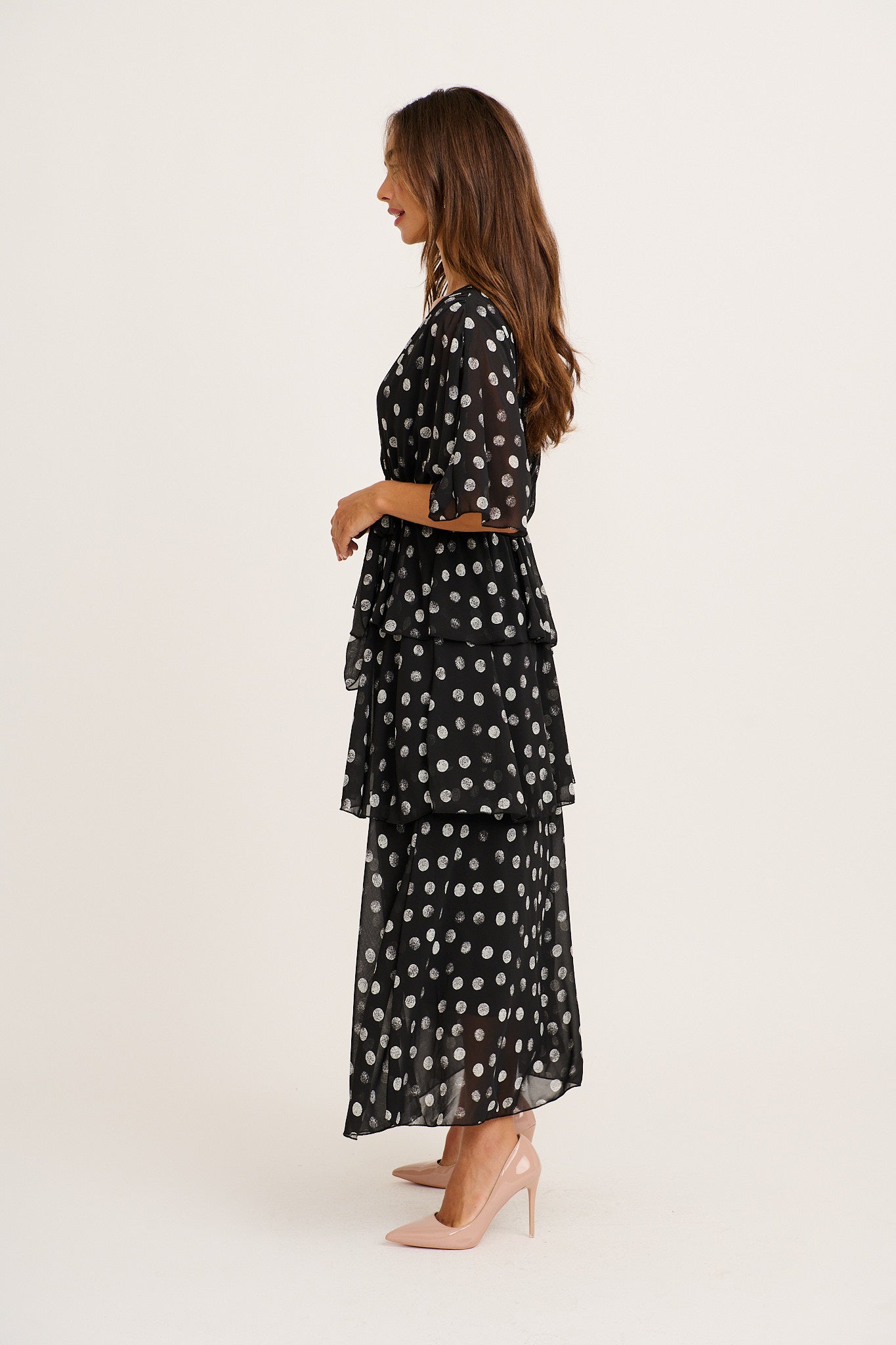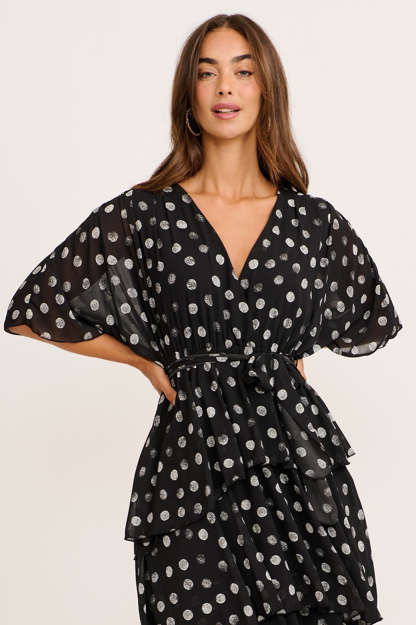 Polished Piece Midi Dress in Black with Cream Polka Dot Chiffon