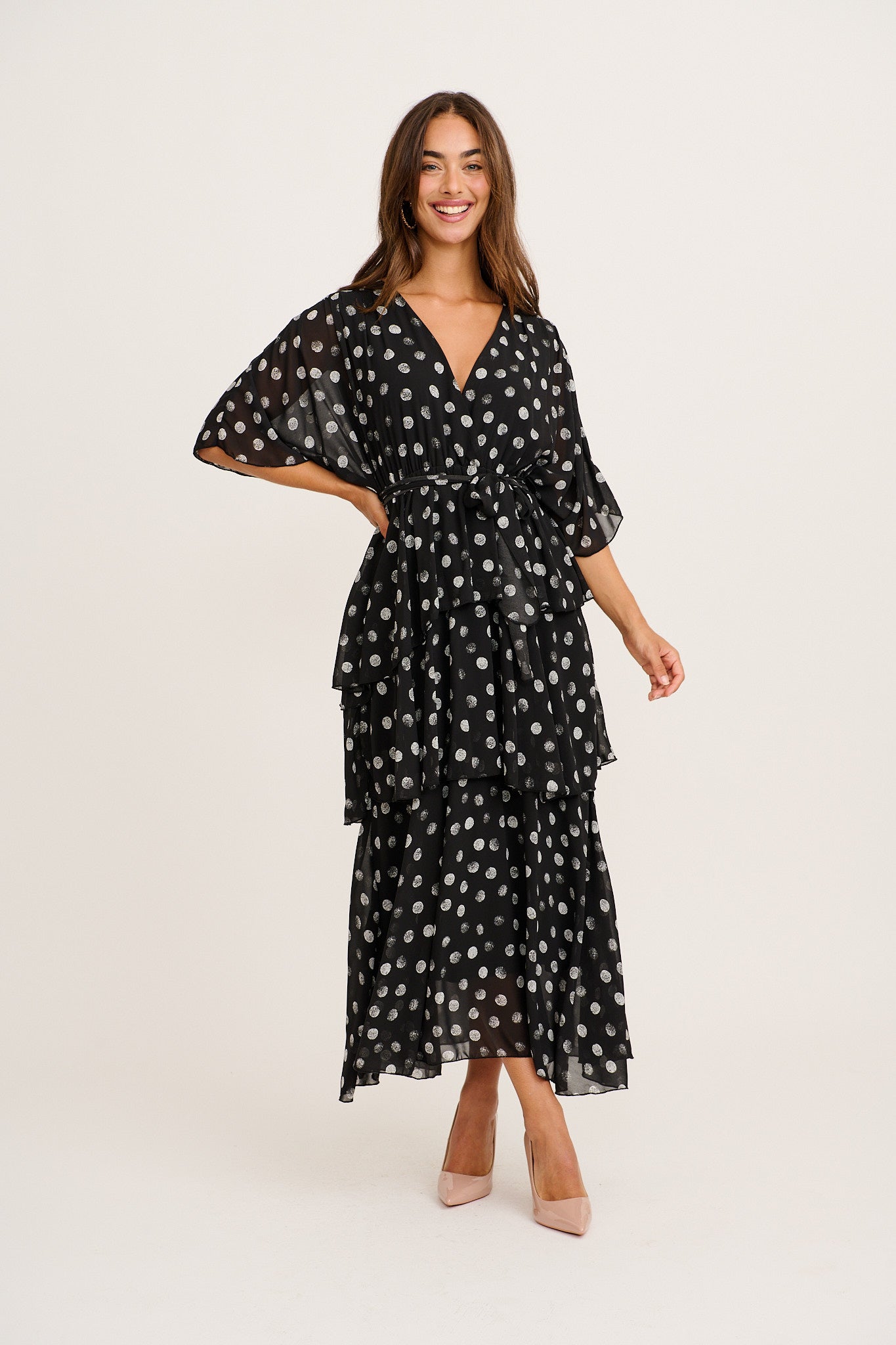 The elasticised mock wrap waist creates a flattering shape, complemented by a separate waist tie to define your figure. A tiered midi skirt enhances its feminine appeal, while the kimono-style sleeves add graceful coverage. Fully lined through the body and skirt, it’s the perfect balance of comfort and occasion-ready polish.