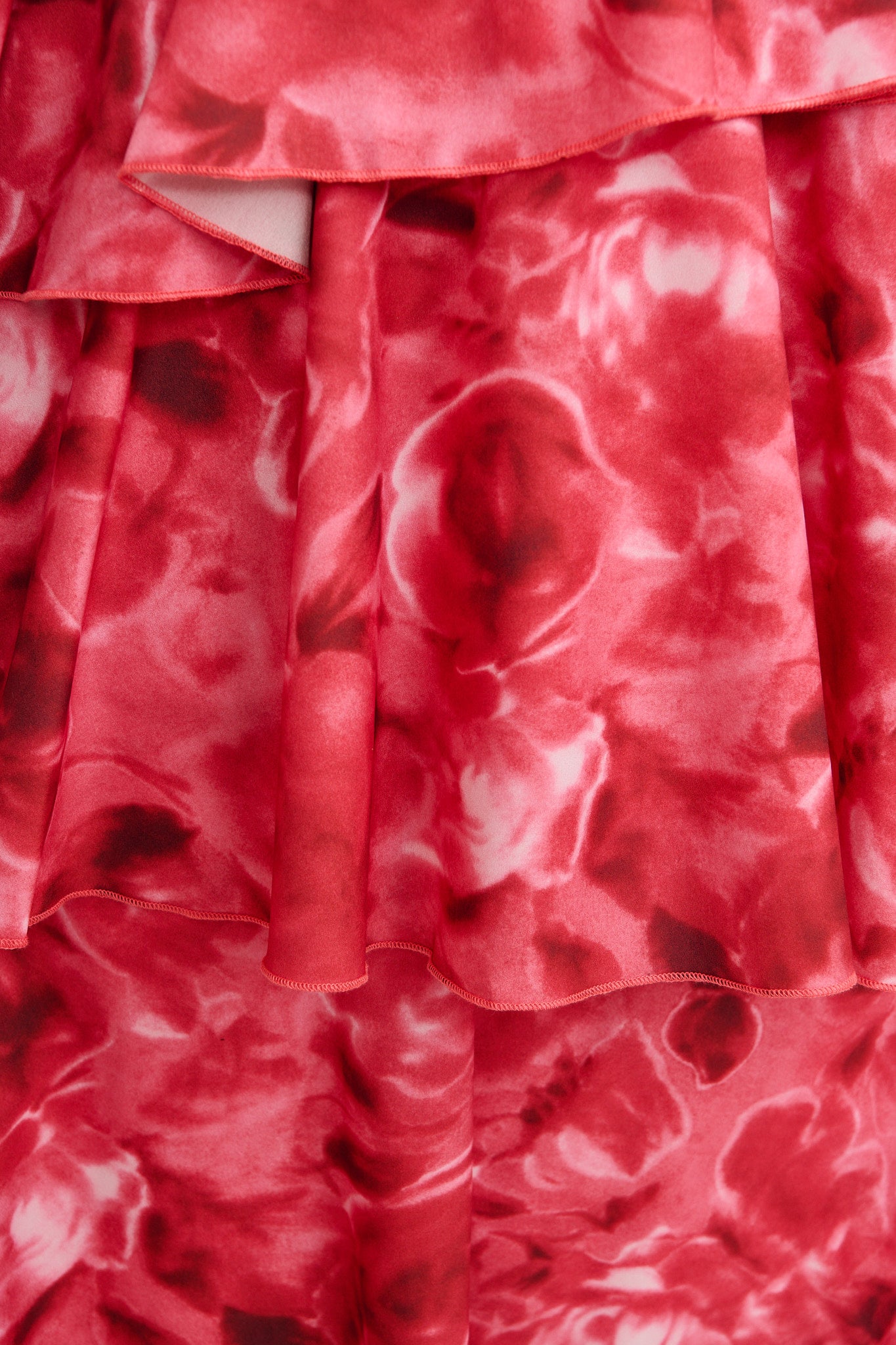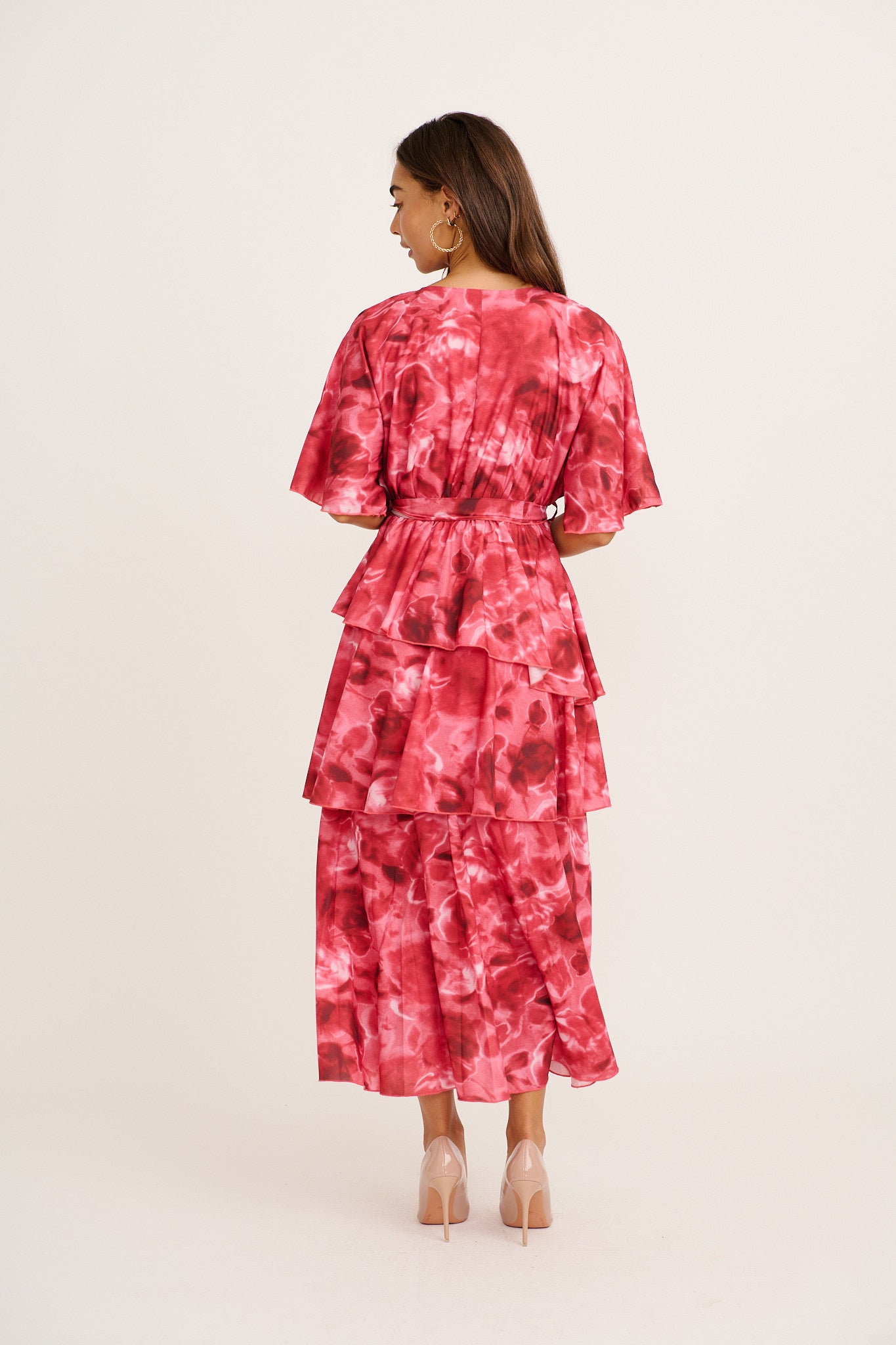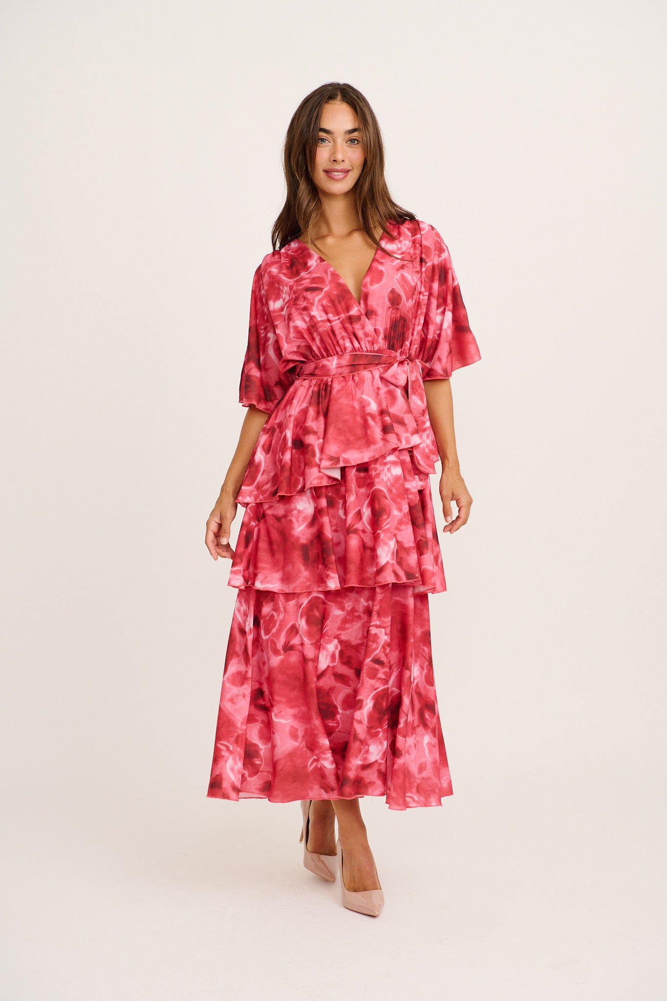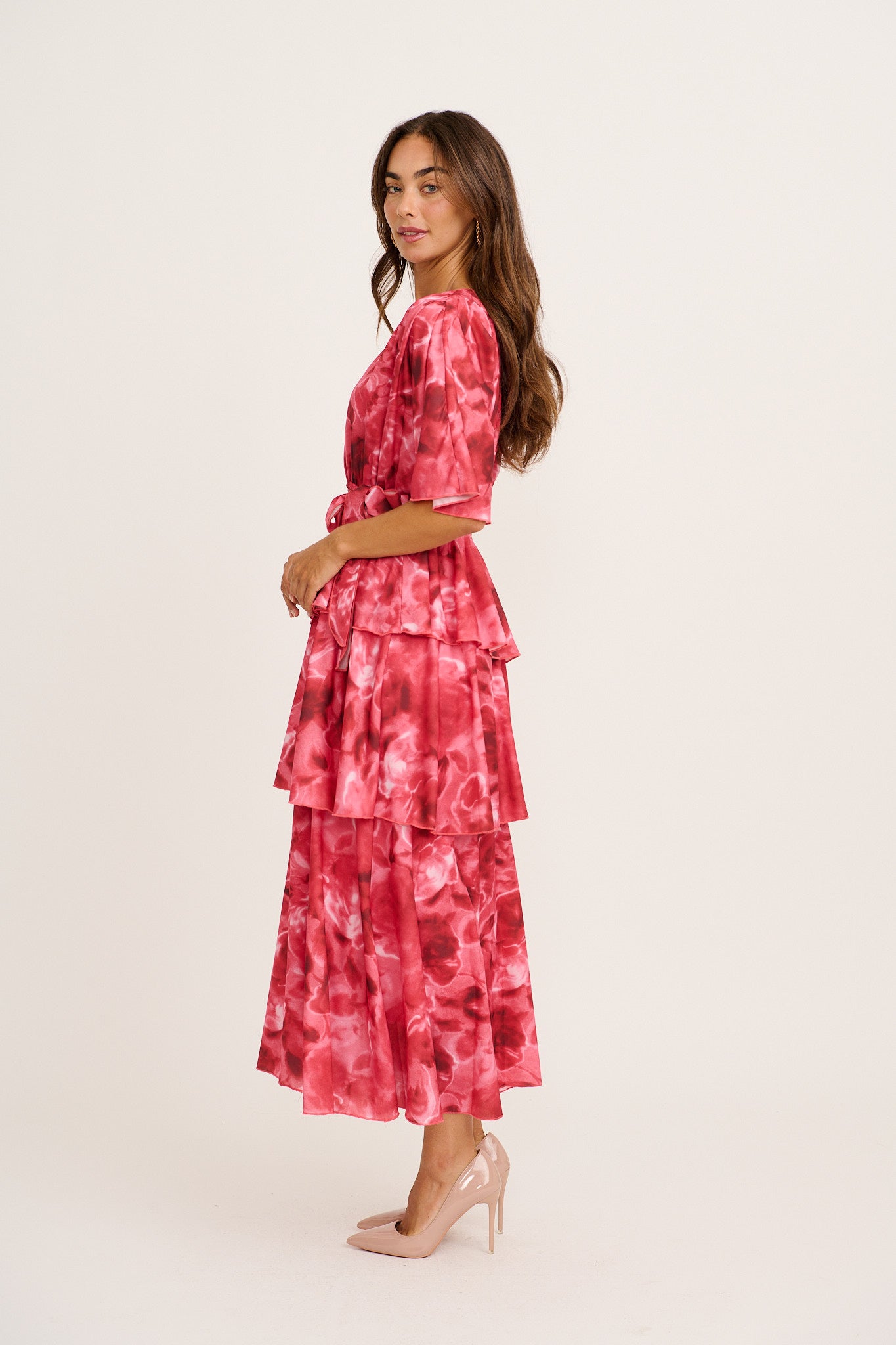 The soft watercolour print adds a dreamy touch, complemented by a flattering V neckline and fluid half sleeves. A tiered midi skirt enhances movement, while the separate waist tie allows you to define your shape with ease. Fully lined through the bodice and skirt, it’s both comfortable and event-ready.