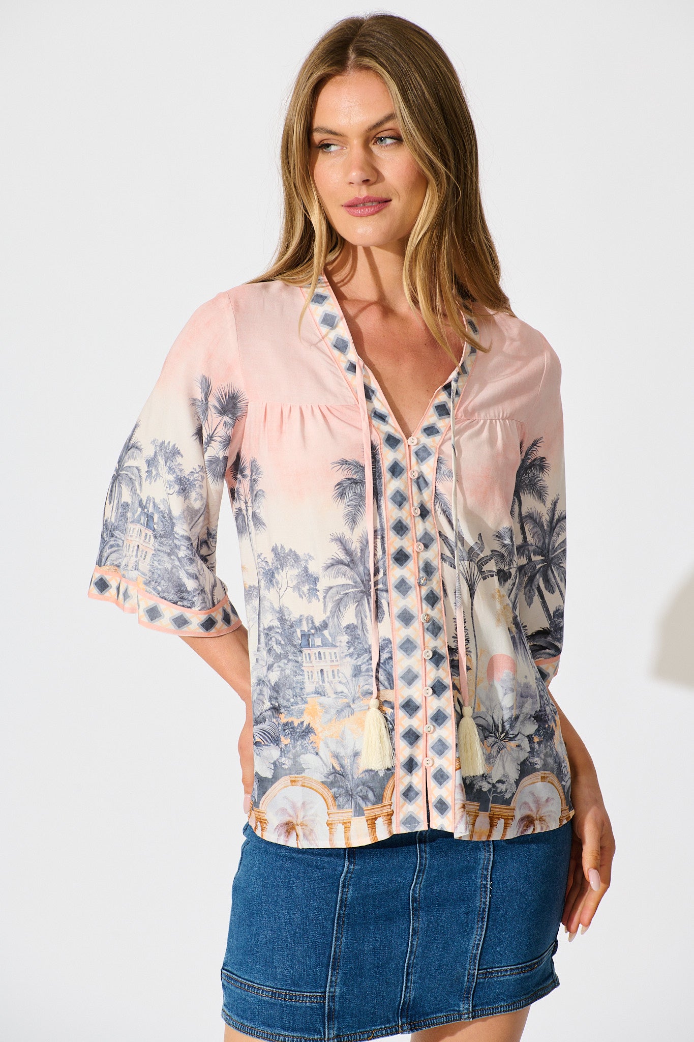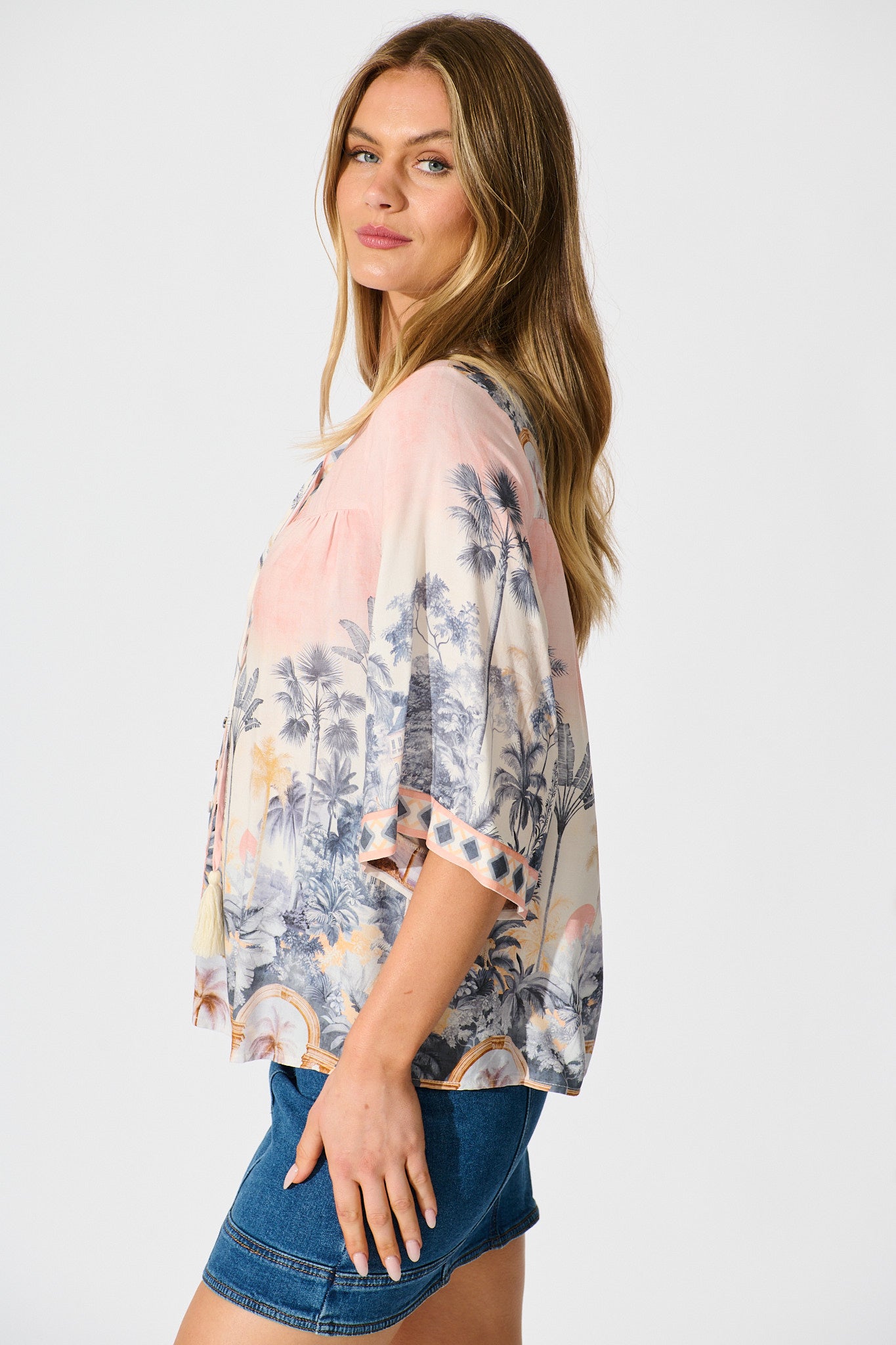 Embrace your playful side with our Portobello Top, our fun new Palm Print brings casual relaxed feel, an easy add on to any wardrobe. Features a a tassle and tie up at front and button detailing.