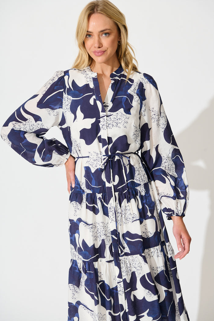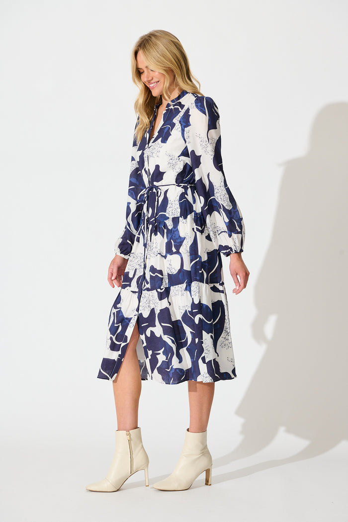 Prestige Midi Dress in White and Navy Print
