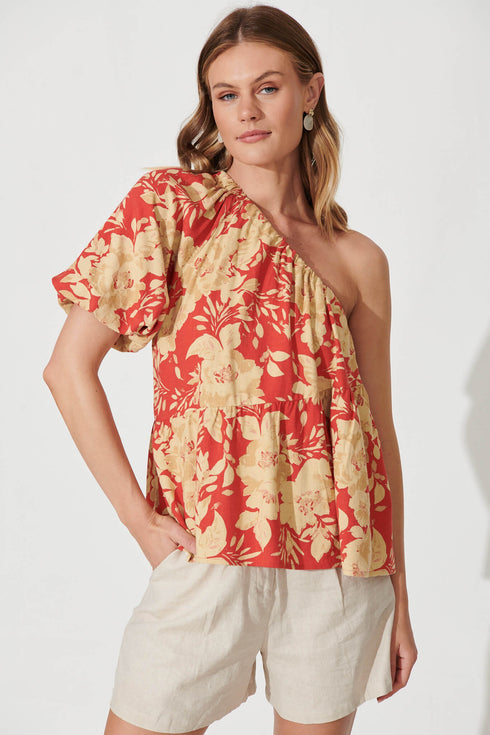 Quest One Shoulder Top In Red With Beige Floral Linen Blend