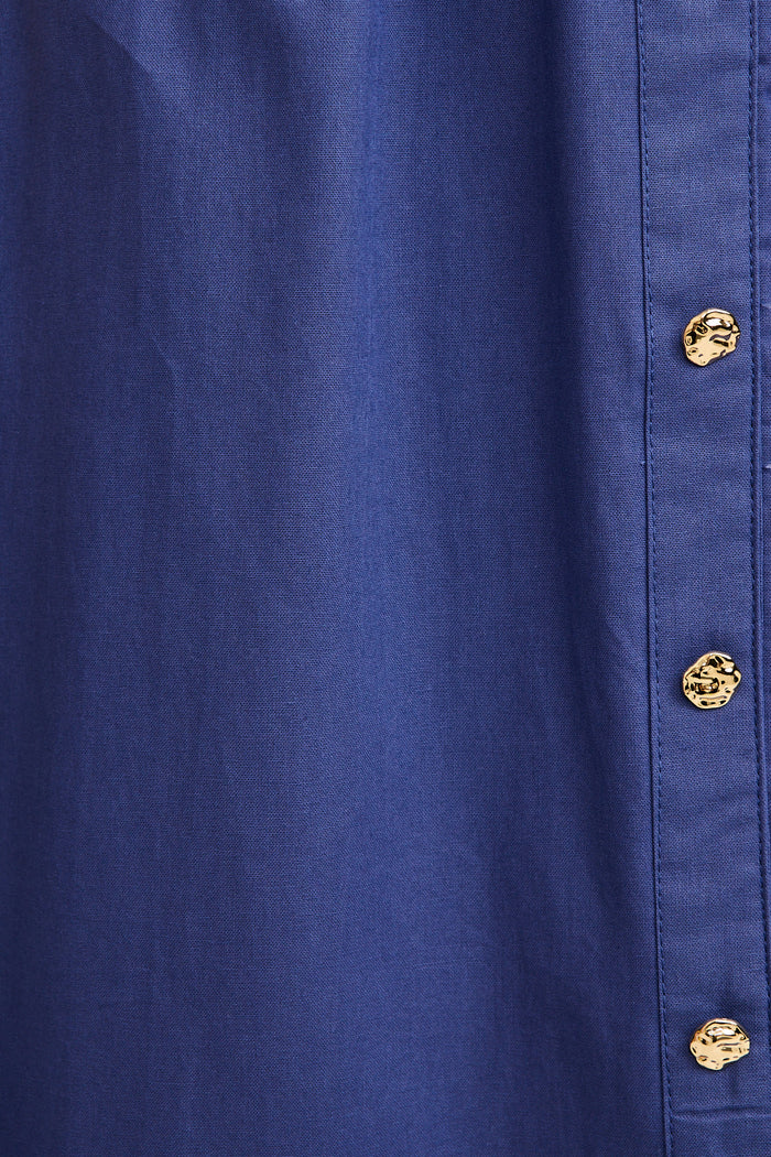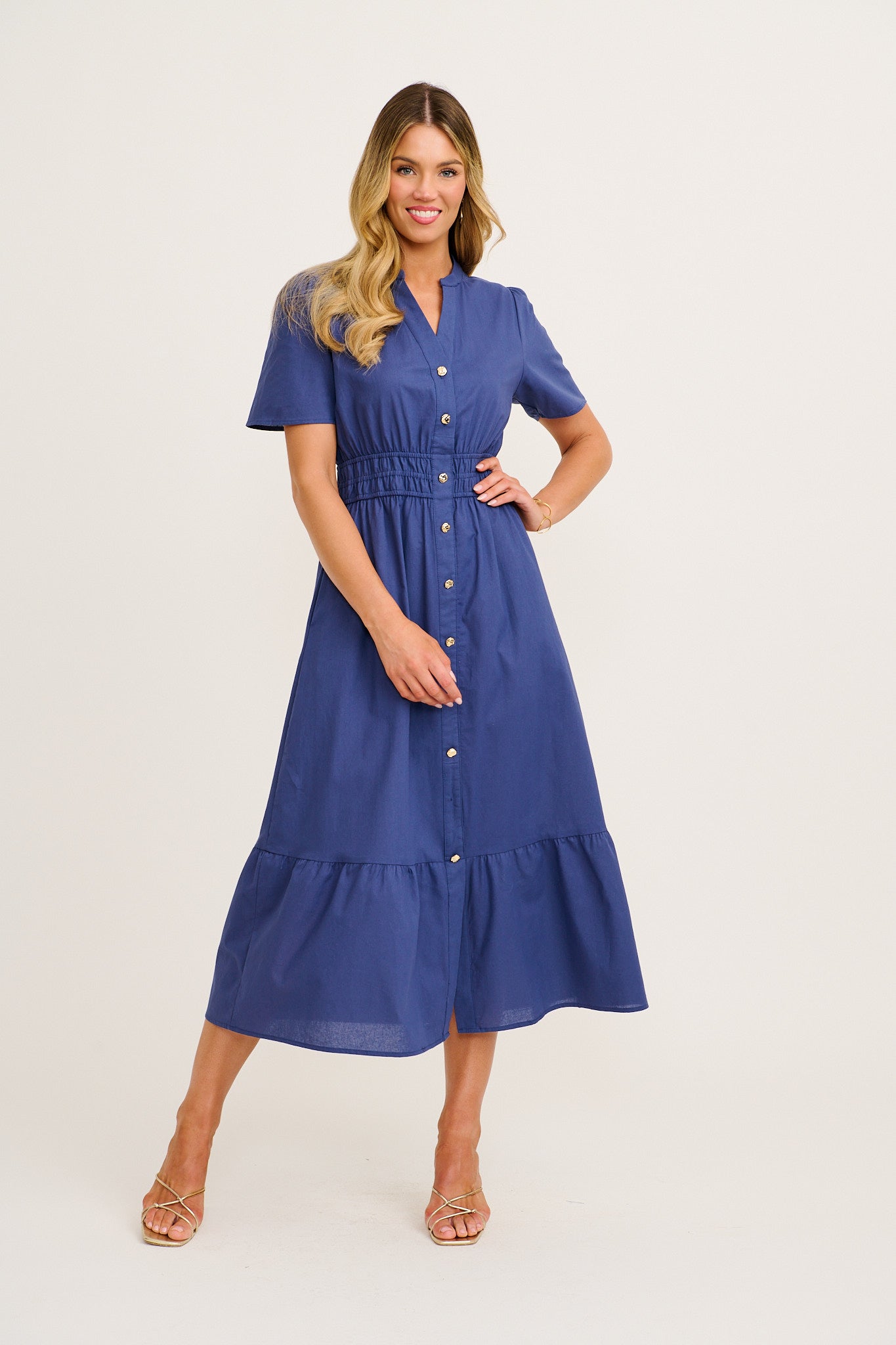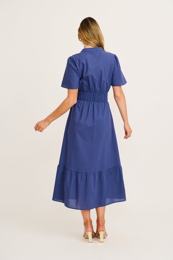 Crafted from lightweight, breathable 100% cotton, it features a flattering V‑neckline paired with a Mandarin collar, textured metal buttons, and an encased elasticised waist that softly cinches your shape. Tiered skirting gives subtle movement, while convenient pockets add everyday ease. Breastfeeding‑friendly and easy to wear, this navy midi is a timeless staple.