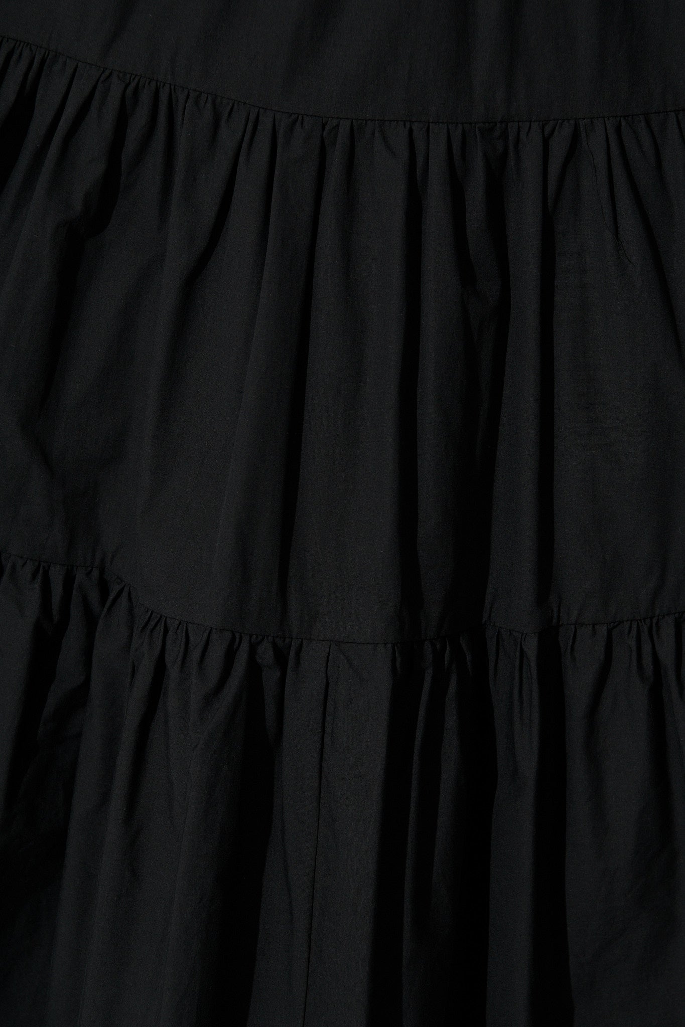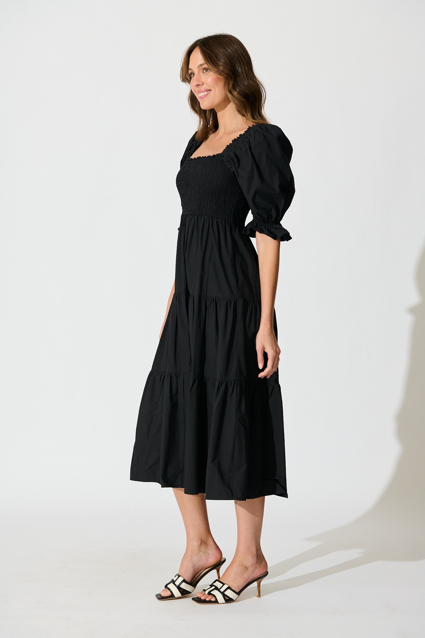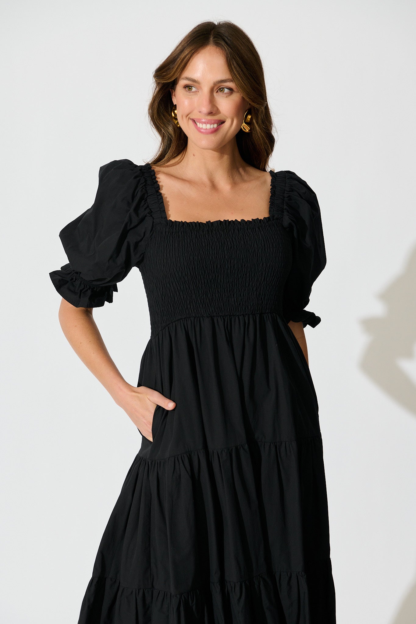 The Rahima Midi Dress in Black Cotton is the chic capsule essential your wardrobe needs. With its flattering square neckline and shirred bodice, this dress offers structure and movement while maintaining an effortless edge.