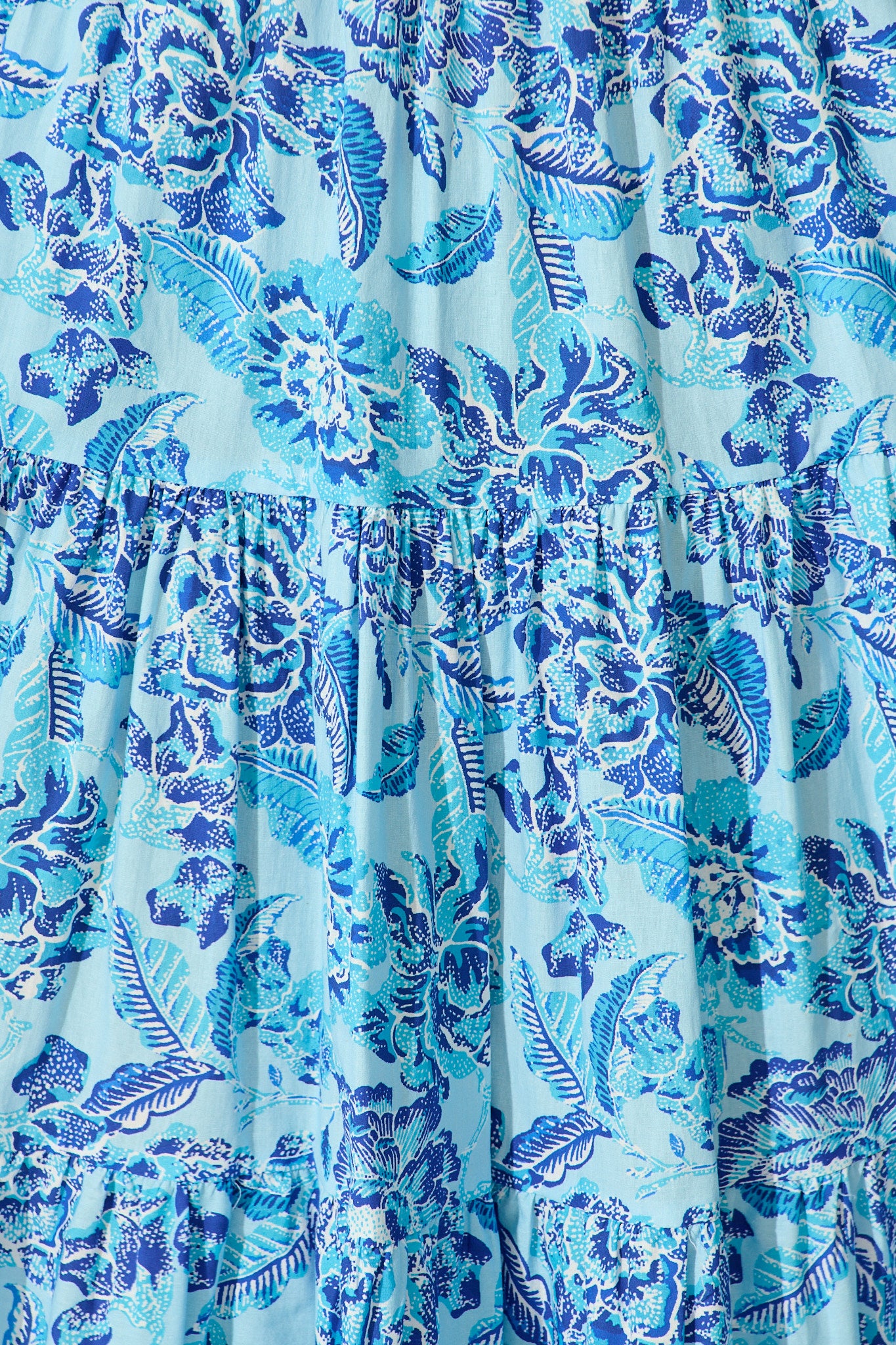The Rahima Midi Dress in Blue Floral Cotton is a breathable favourite with soft volume and shape. The shirred bodice and tiered skirt offer relaxed comfort, while puff sleeves and florals bring a fresh, feminine edge.