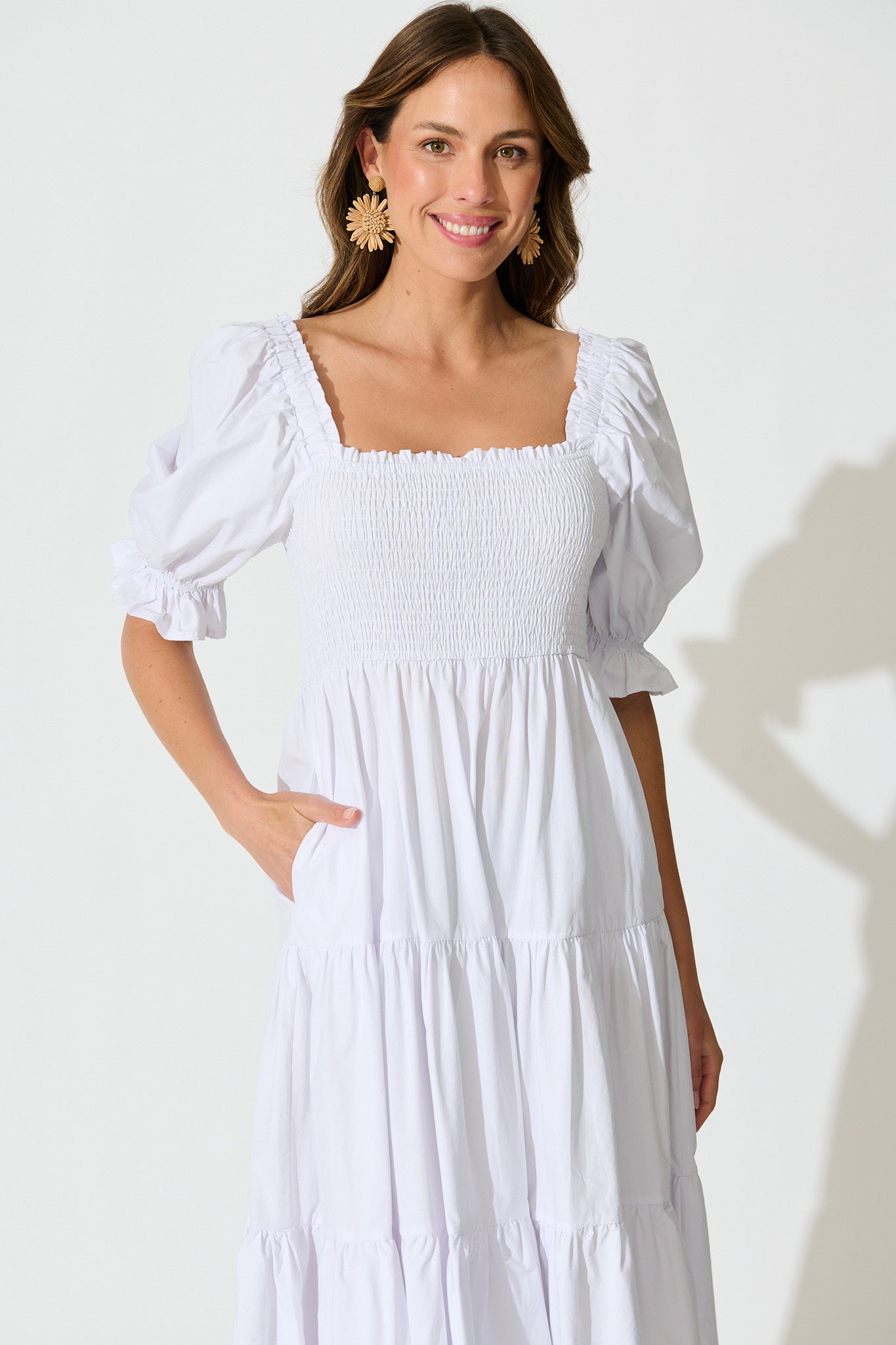 Made for sun-drenched days and breezy afternoons, the Rahima Midi Dress in White Cotton is your crisp and timeless wardrobe staple. Its shirred bodice gently hugs the waist before falling into a softly tiered skirt that moves with you—effortlessly feminine, endlessly wearable.