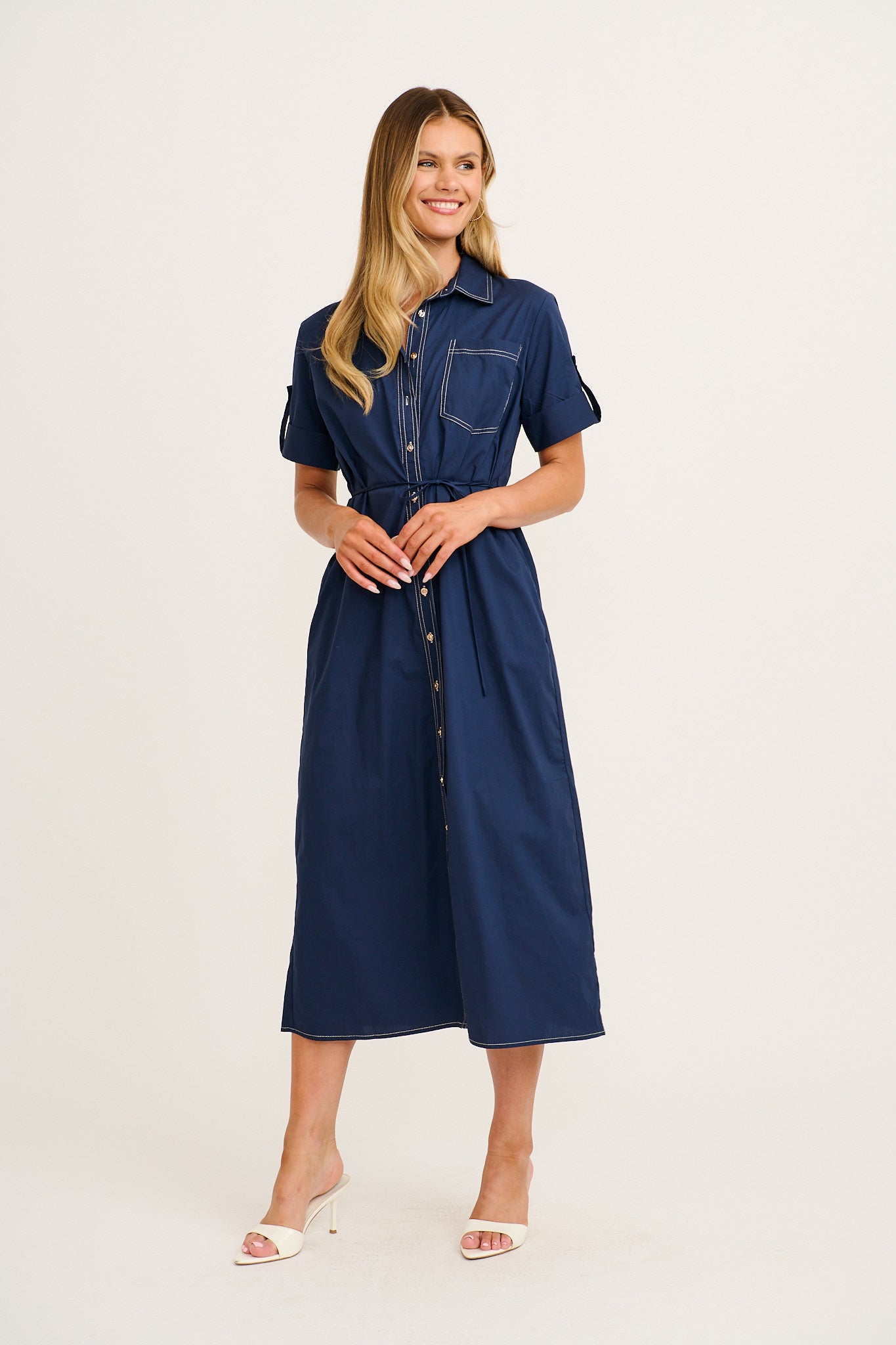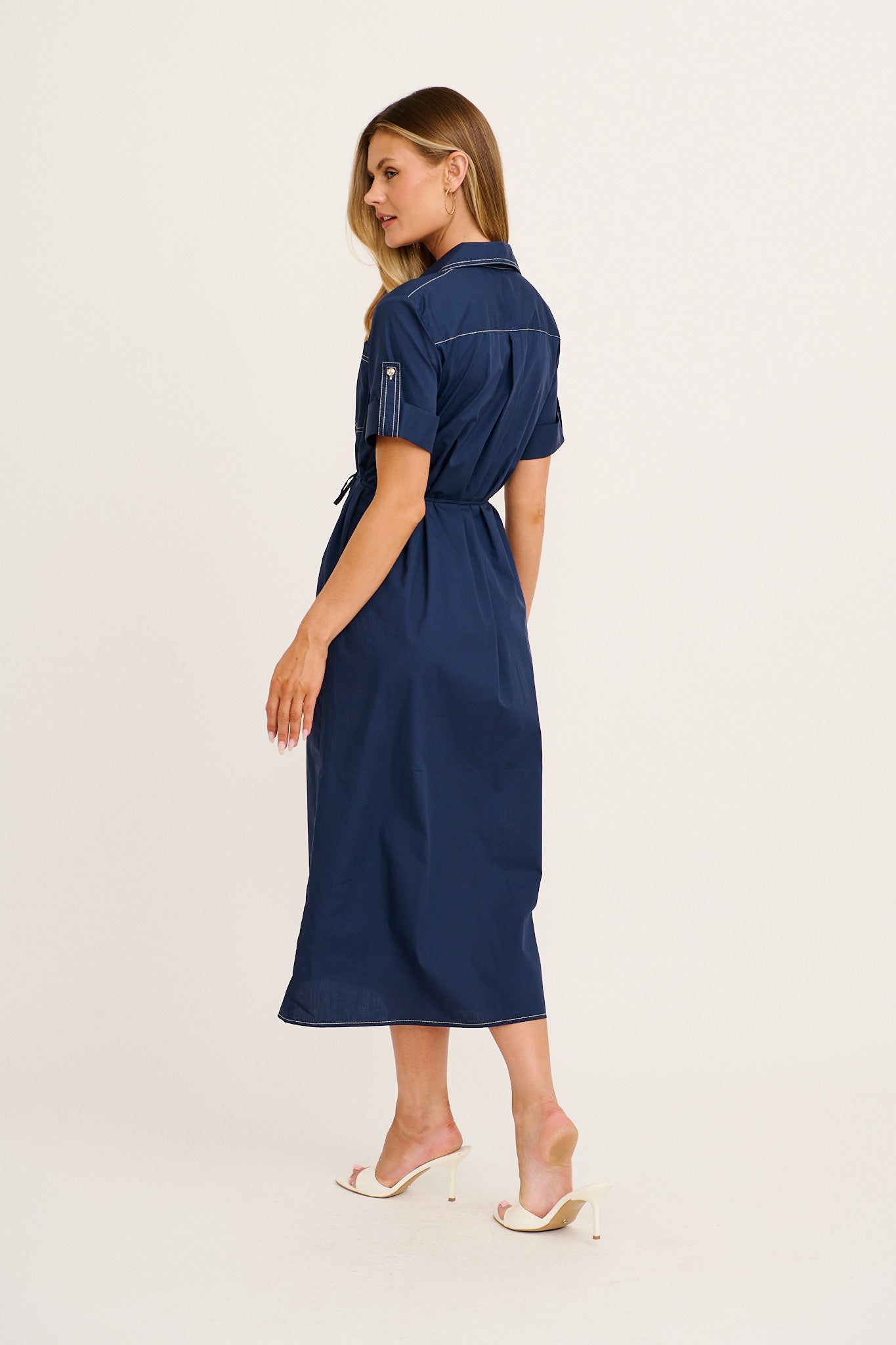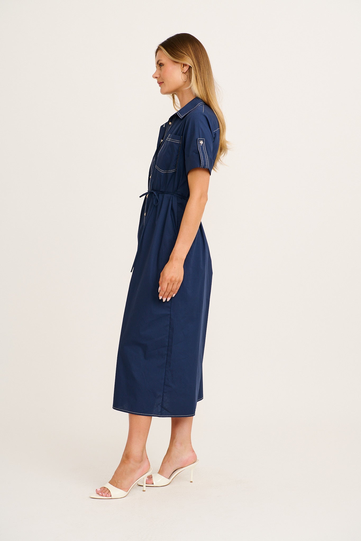 Contrast stitching and a chest patch pocket lend a modern, utility-inspired edge, while the self waist tie and midi length keep the look feminine and versatile. Finished with rolled short sleeves and practical side pockets, it’s your go-to for effortless dressing — from desk to dinner.