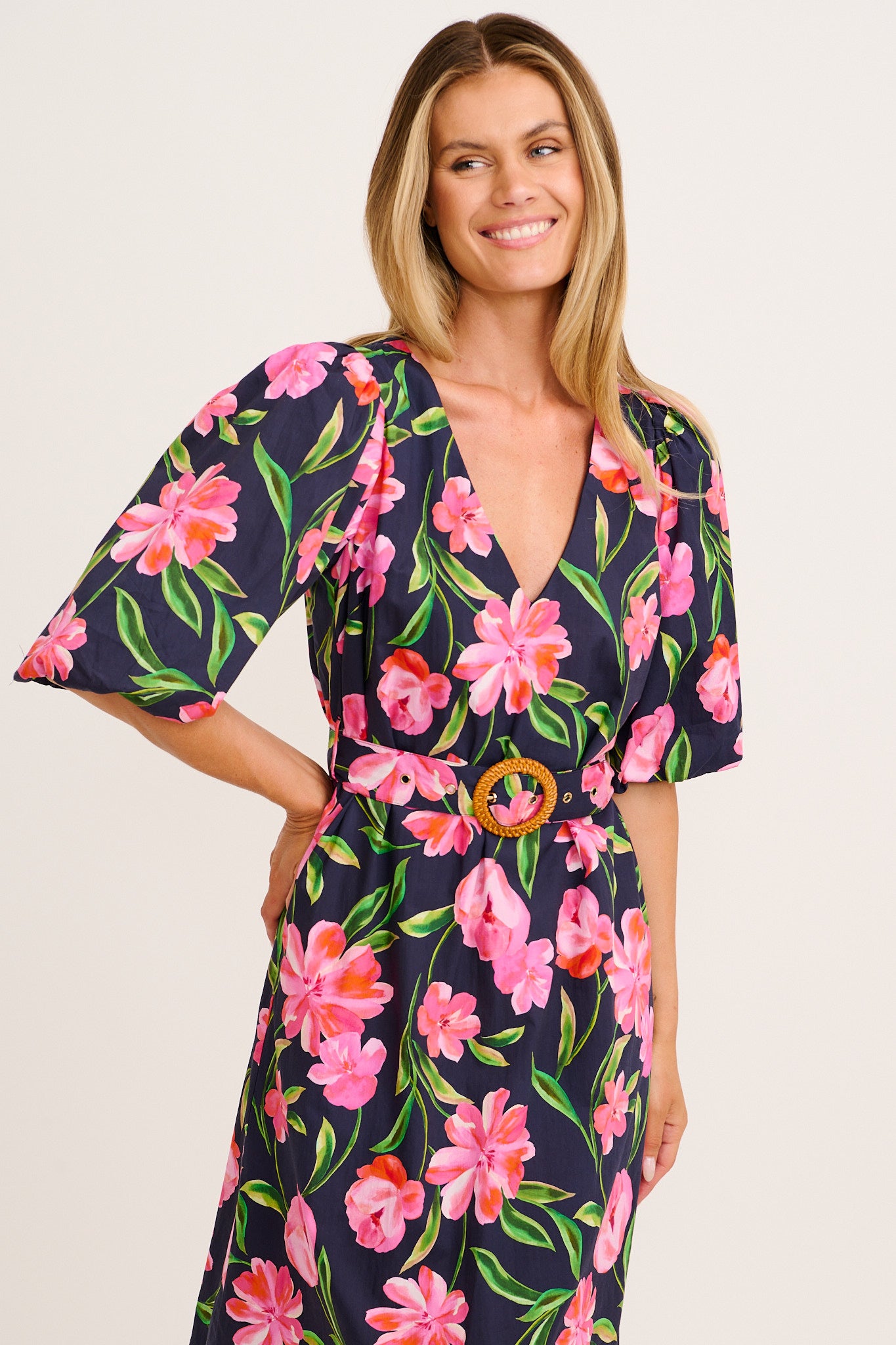 The Rhaya Maxi Dress in Navy With Pink Floral Cotton brings breezy elegance to your everyday wardrobe. Made from soft, breathable cotton, this relaxed silhouette features thoughtful details that combine comfort and style effortlessly.