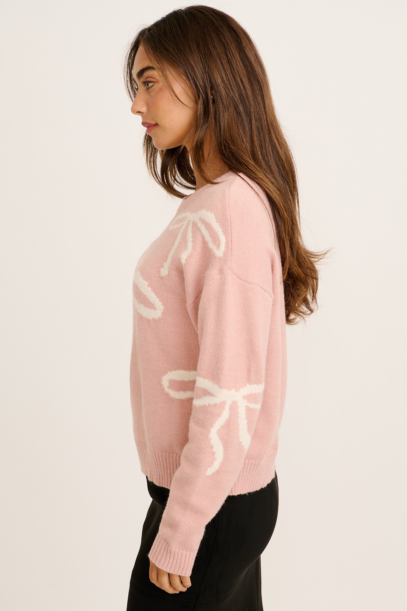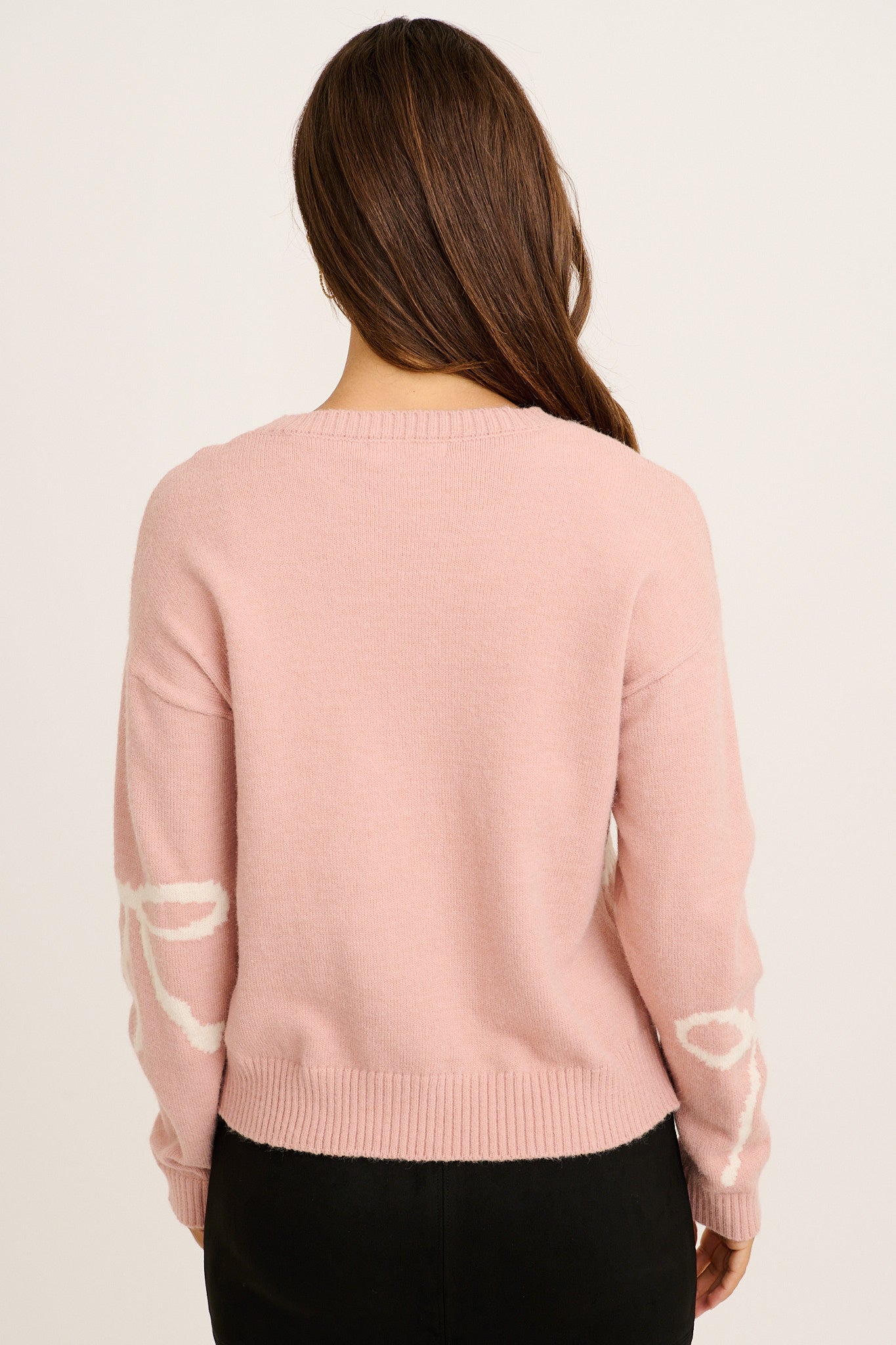 Crafted from a midweight stretch knit, it features a classic round neckline and ribbed trims for a comfortable, flattering fit. The intarsia bow pattern adds texture and visual interest, while the relaxed silhouette makes it easy to layer through the cooler months.