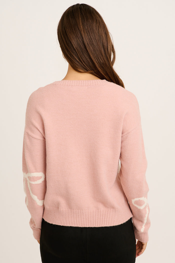 The Ribbon Romance Knit in Pink with White Bows brings a playful yet polished touch to your knitwear collection. Designed in a soft dusty pink base with statement white bow detailing, this cosy style blends charm with everyday versatility.