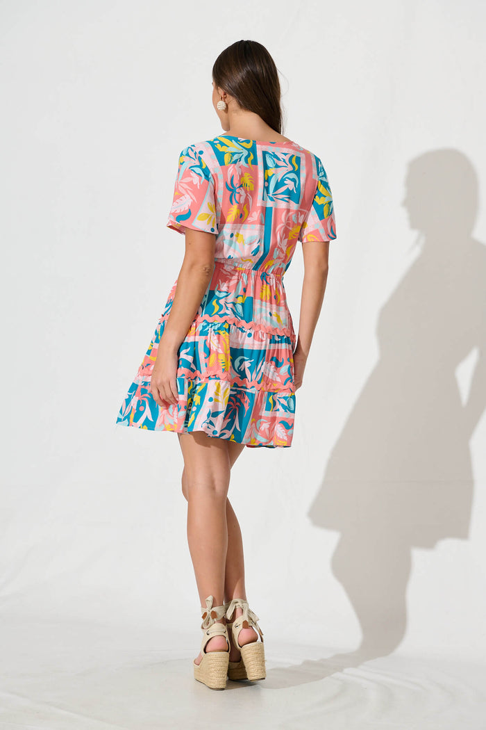 Rimini Dress In Blue Multi Print With Pink Ric Rac Trim