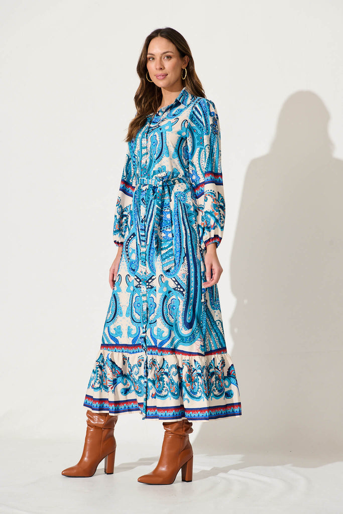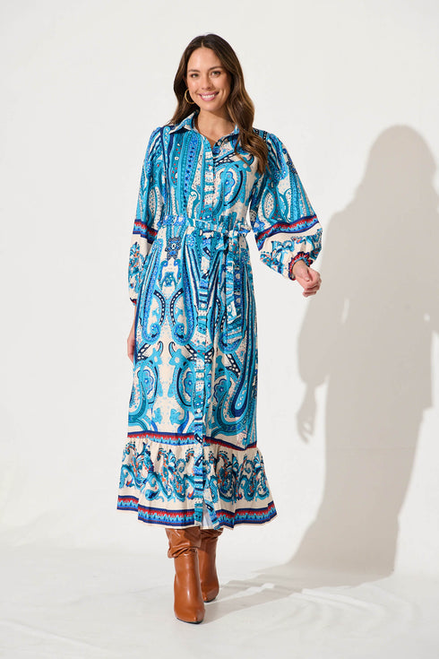 Romy Maxi Shirt Dress In White With Blue Border Print