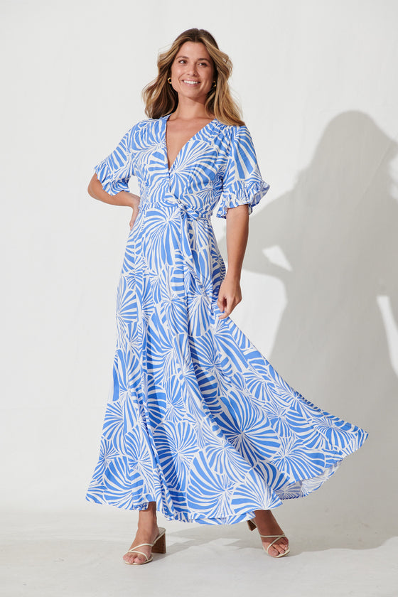 Rondal Maxi Wrap Dress In Blue Leaf Print