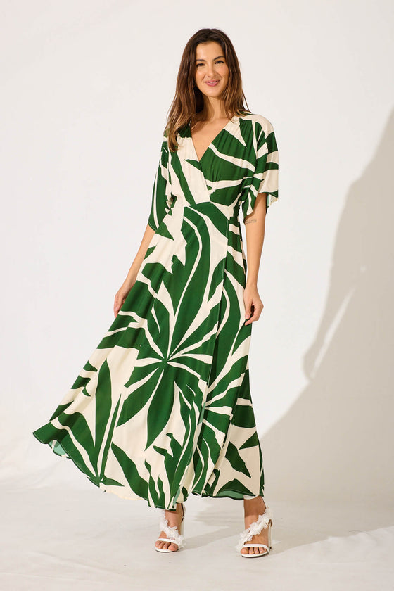 Rondi Maxi Wrap Dress In Khaki With Cream Leaf Print
