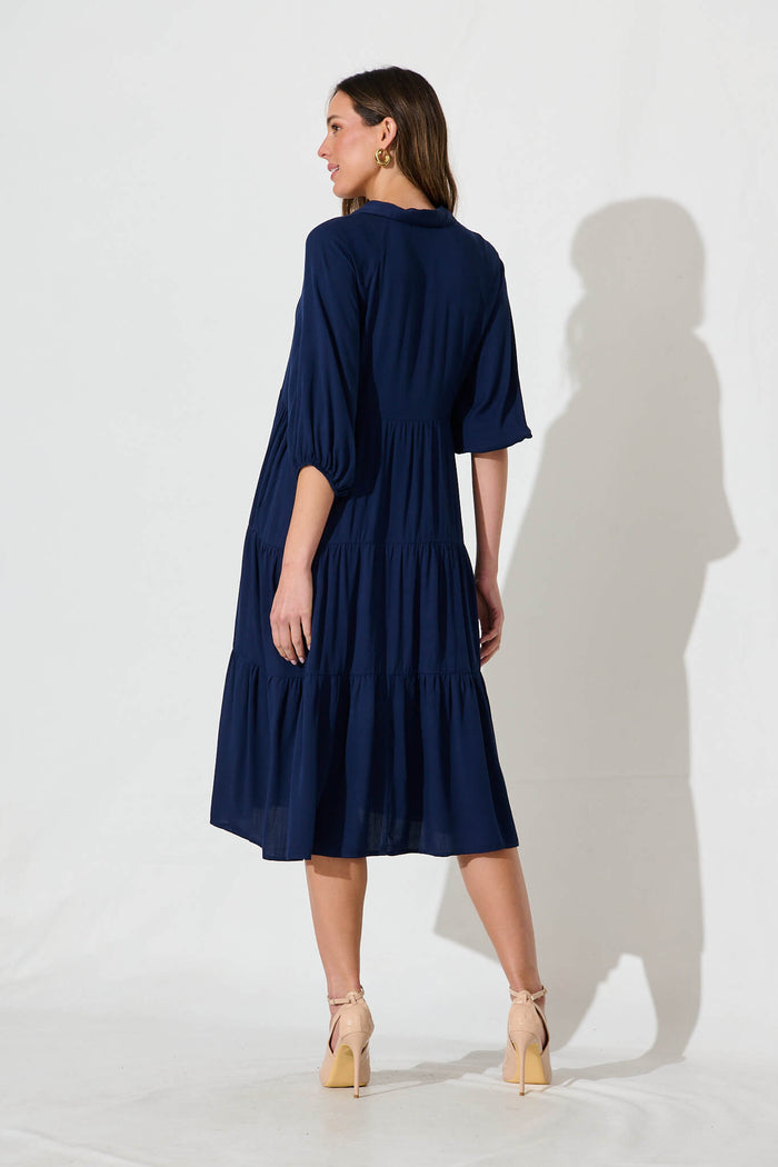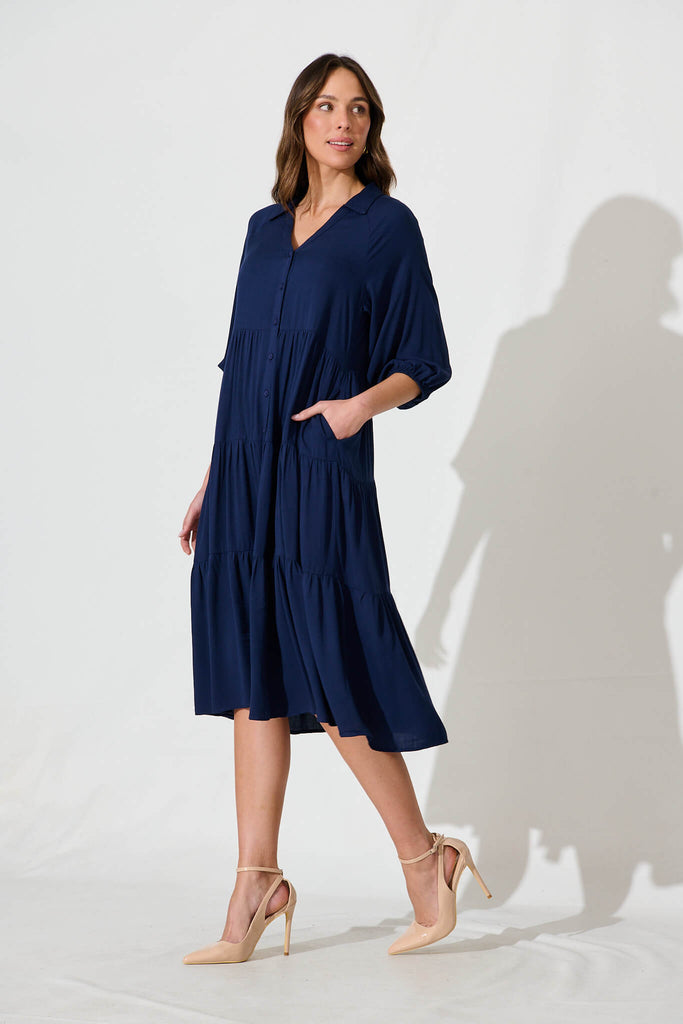 All you need this season is our Roosevelt Midi Smock Dress! This cute midi was designed to be versatile, taking you from day to night events. Features include a button front opening, twin side pockets and a collared neckline.