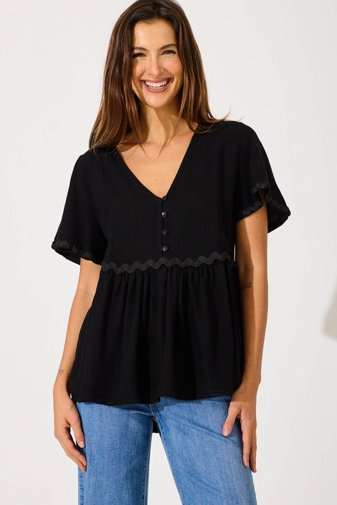 Rory Top In Black With Ric Rac Trim Linen Blend