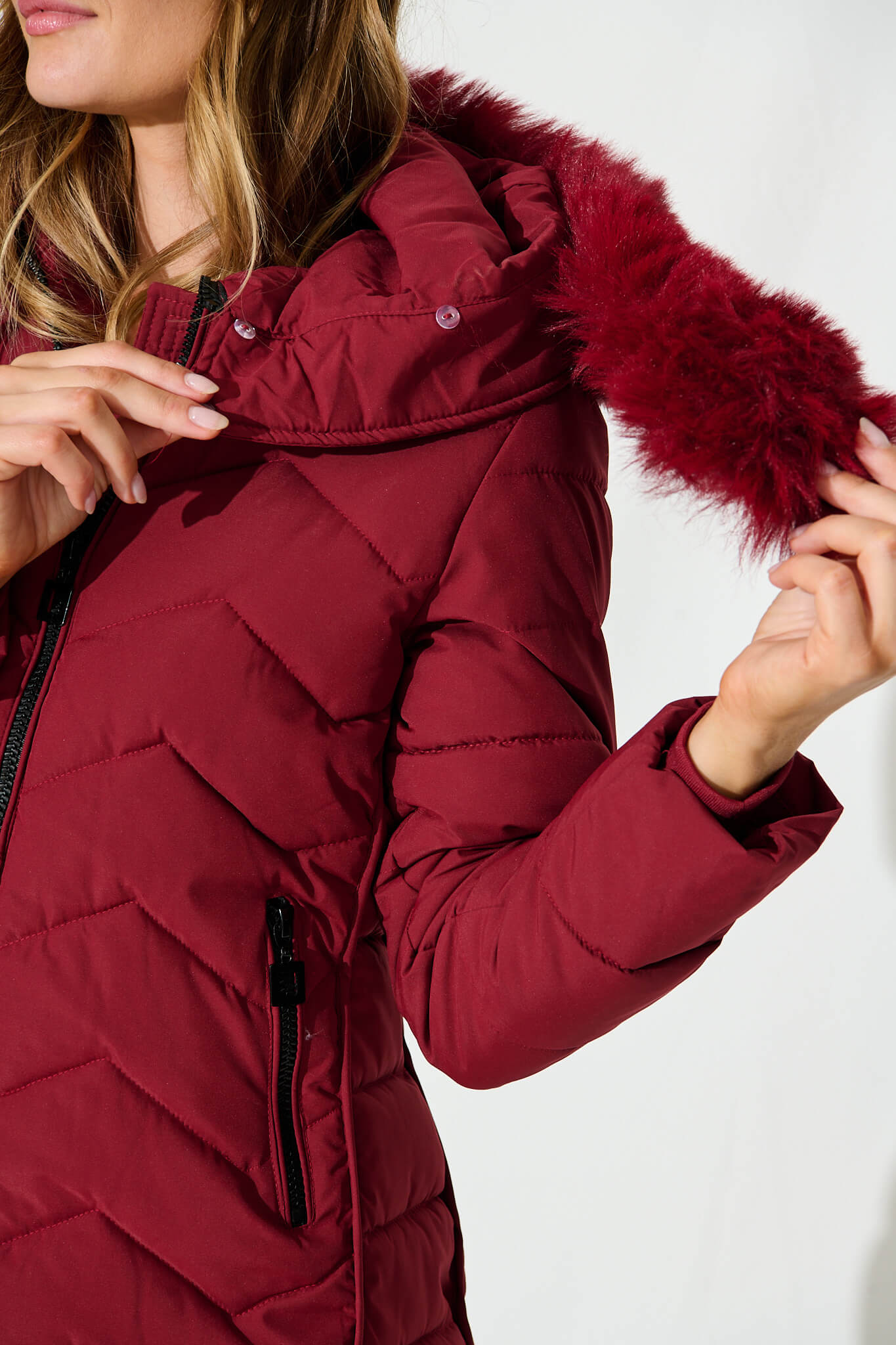 - Attached hood with detachable fur detail
