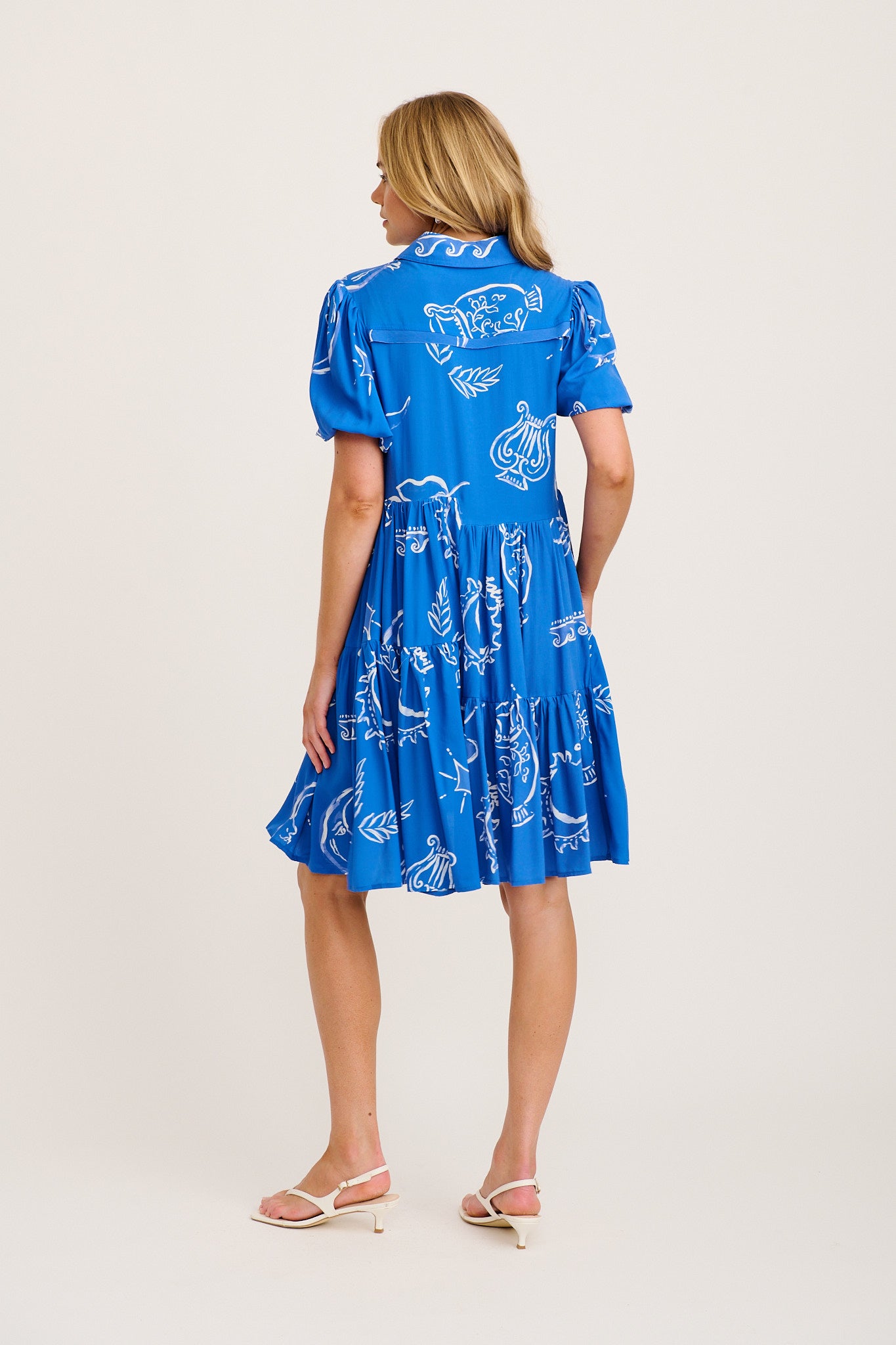 Short puff sleeves are finished with encased elastic cuffs for a soft shape at the arm, and side pockets bring in the comfort factor we all love. The print — a crisp white motif set against a calming blue base — adds just the right amount of detail without overwhelming the look, making it easy to style with your favourite accessories.