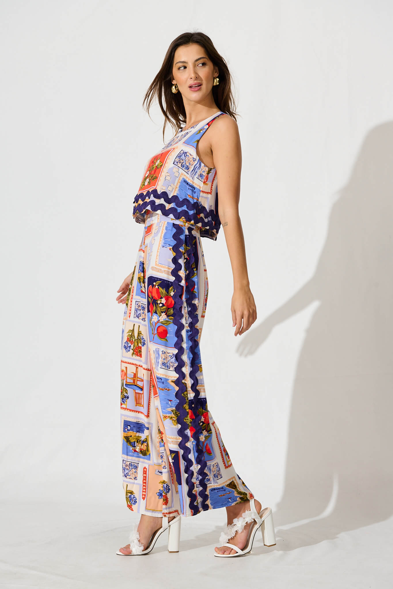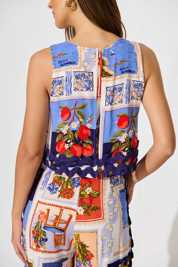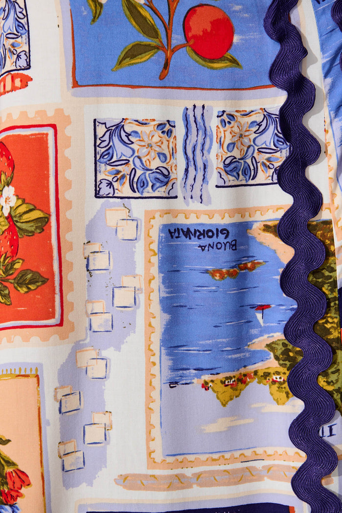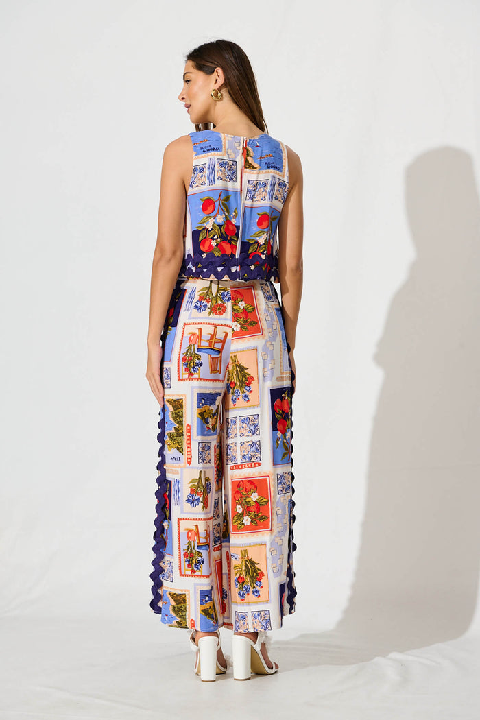 Sandbar Jumpsuit In Blue Multi Postcard Print