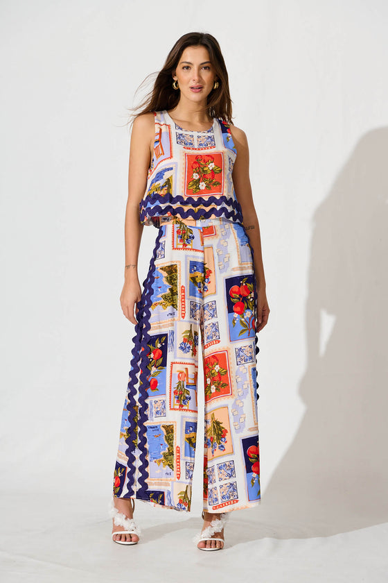 Sandbar Jumpsuit In Blue Multi Postcard Print