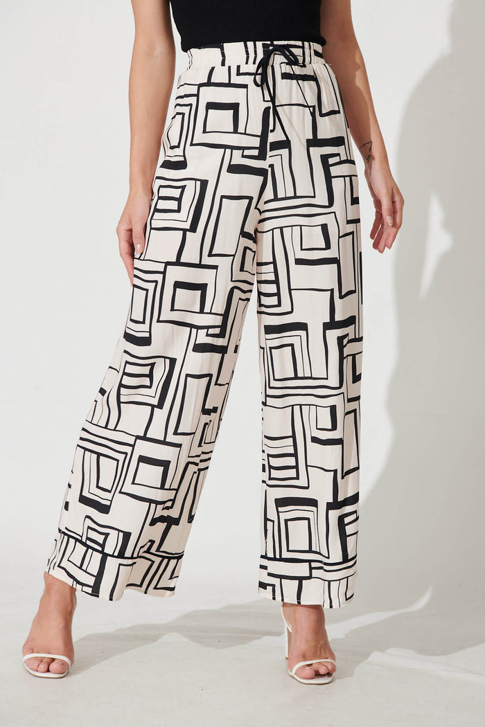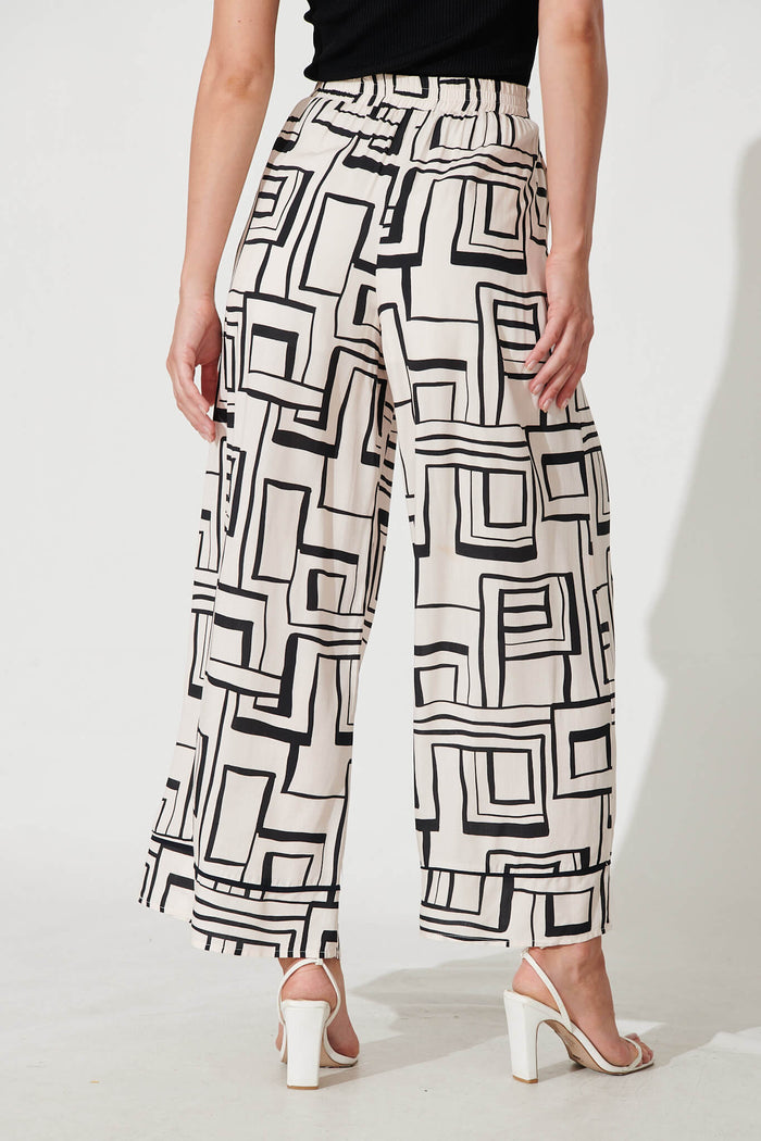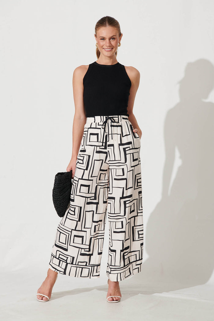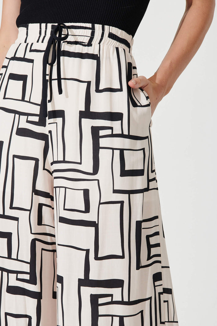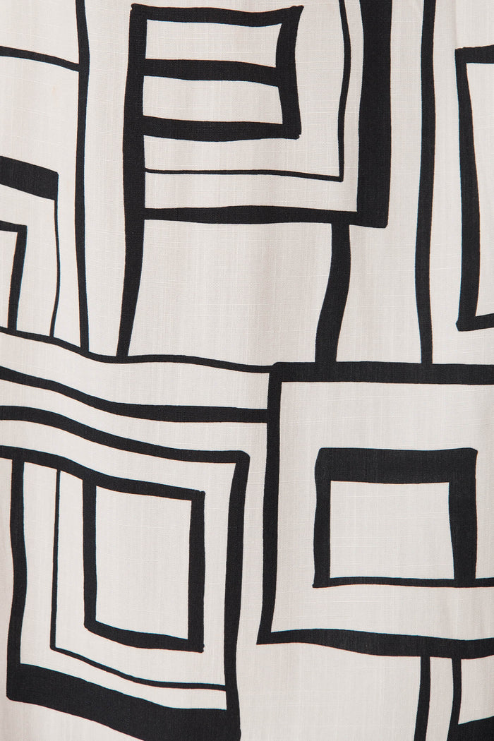 Santa Monica Pants In Cream With Black Geometric Linen Blend