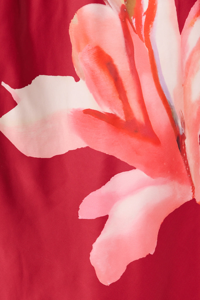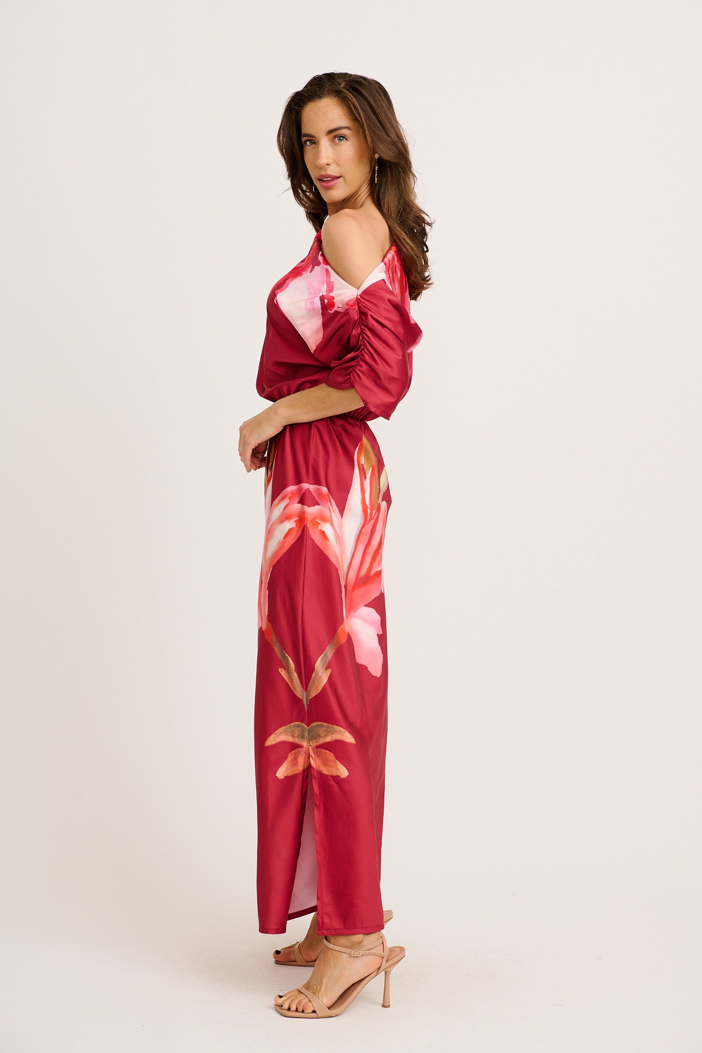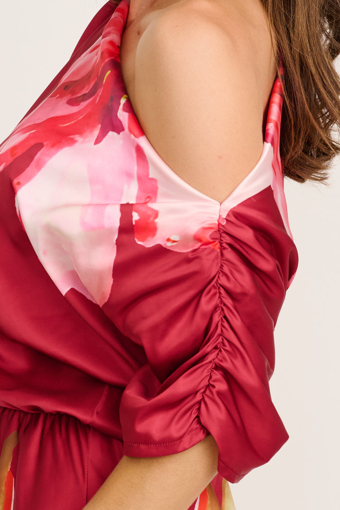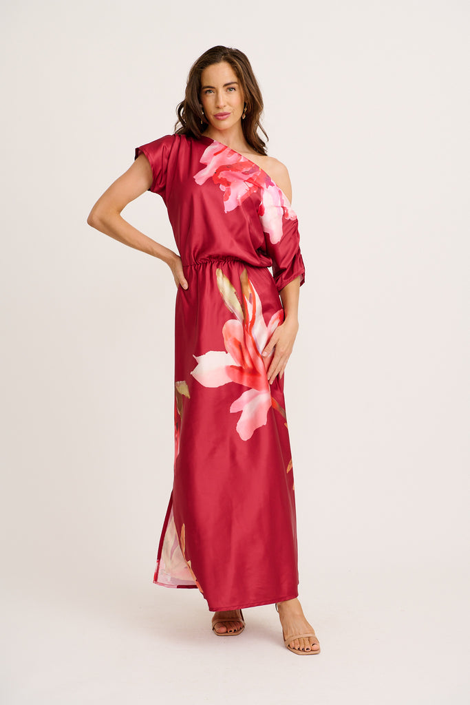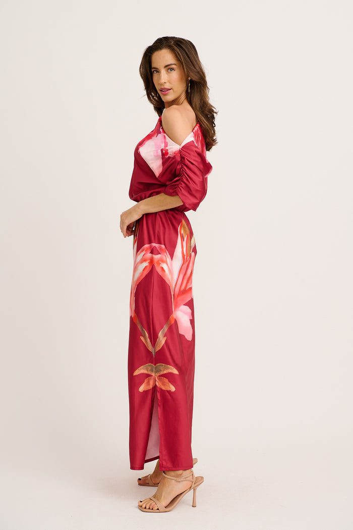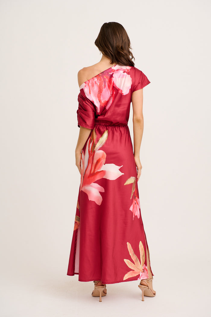 Sarita Maxi Off Shoulder Dress in Multi Pink Floral Satin