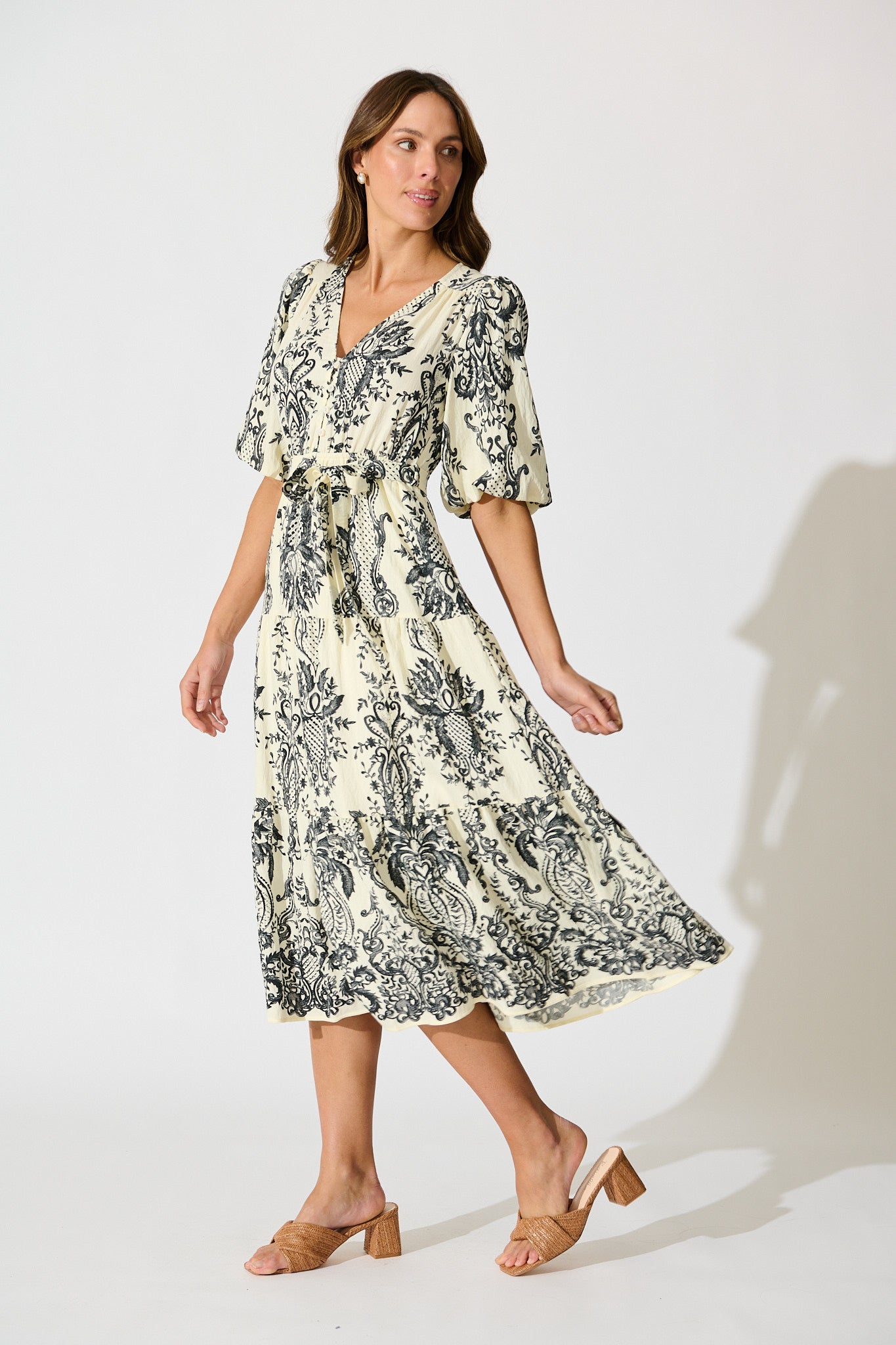 The Savannah Song Midi Dress in White with Black Boho Print is all about soft drama and timeless contrast. Perfect for garden parties, alfresco dinners or spring soirees, this fit-and-flare midi is equal parts breezy and elegant.