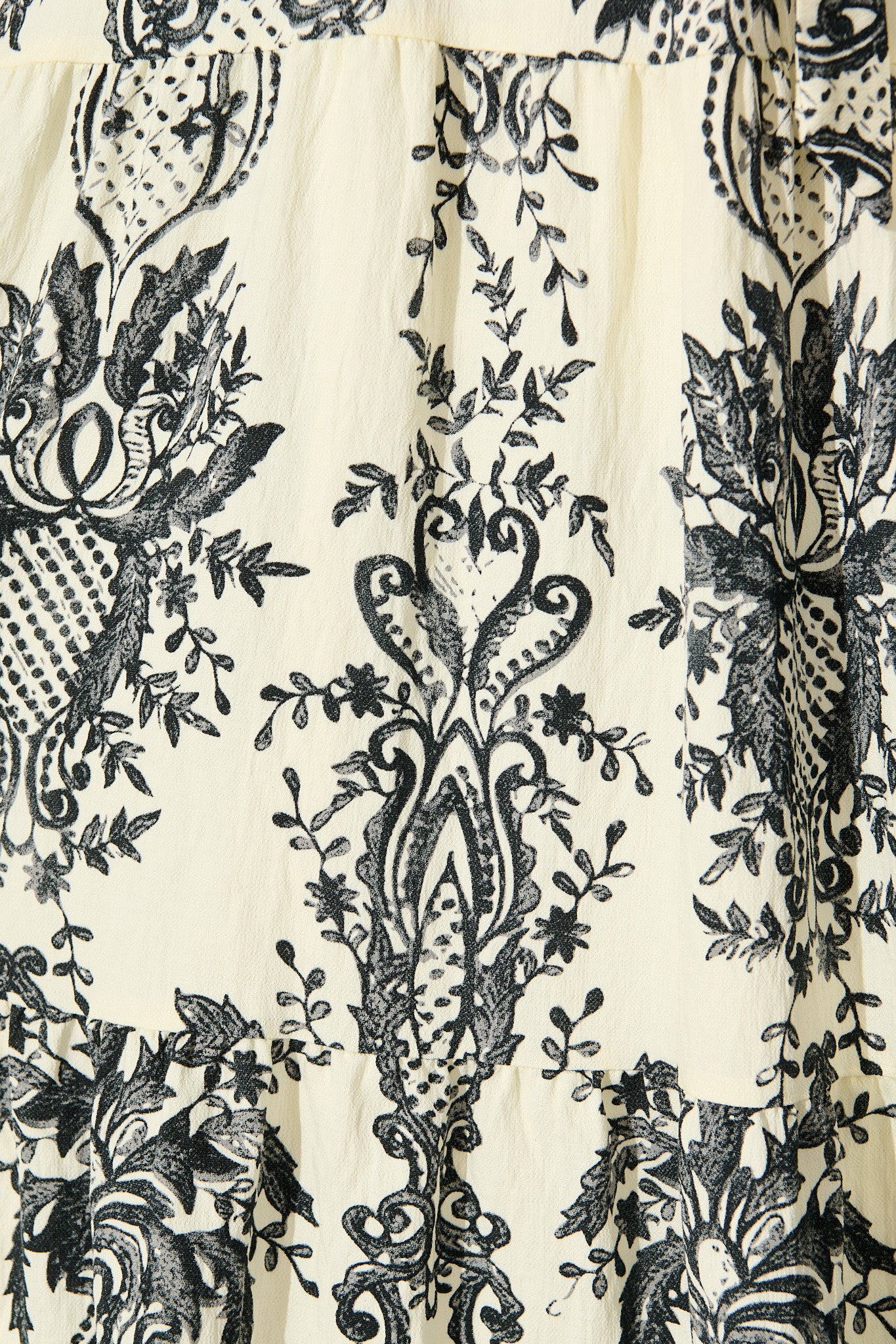 Made from a breathable rayon-nylon blend, it features a flattering V neckline, elasticised waist with a self-fabric tie, and soft puff sleeves. Lined through the sleeves and skirt, it buttons through the front with a looped button finish, adding subtle texture and charm. The black boho print pops beautifully against the white base—making this a standout piece without being too loud.