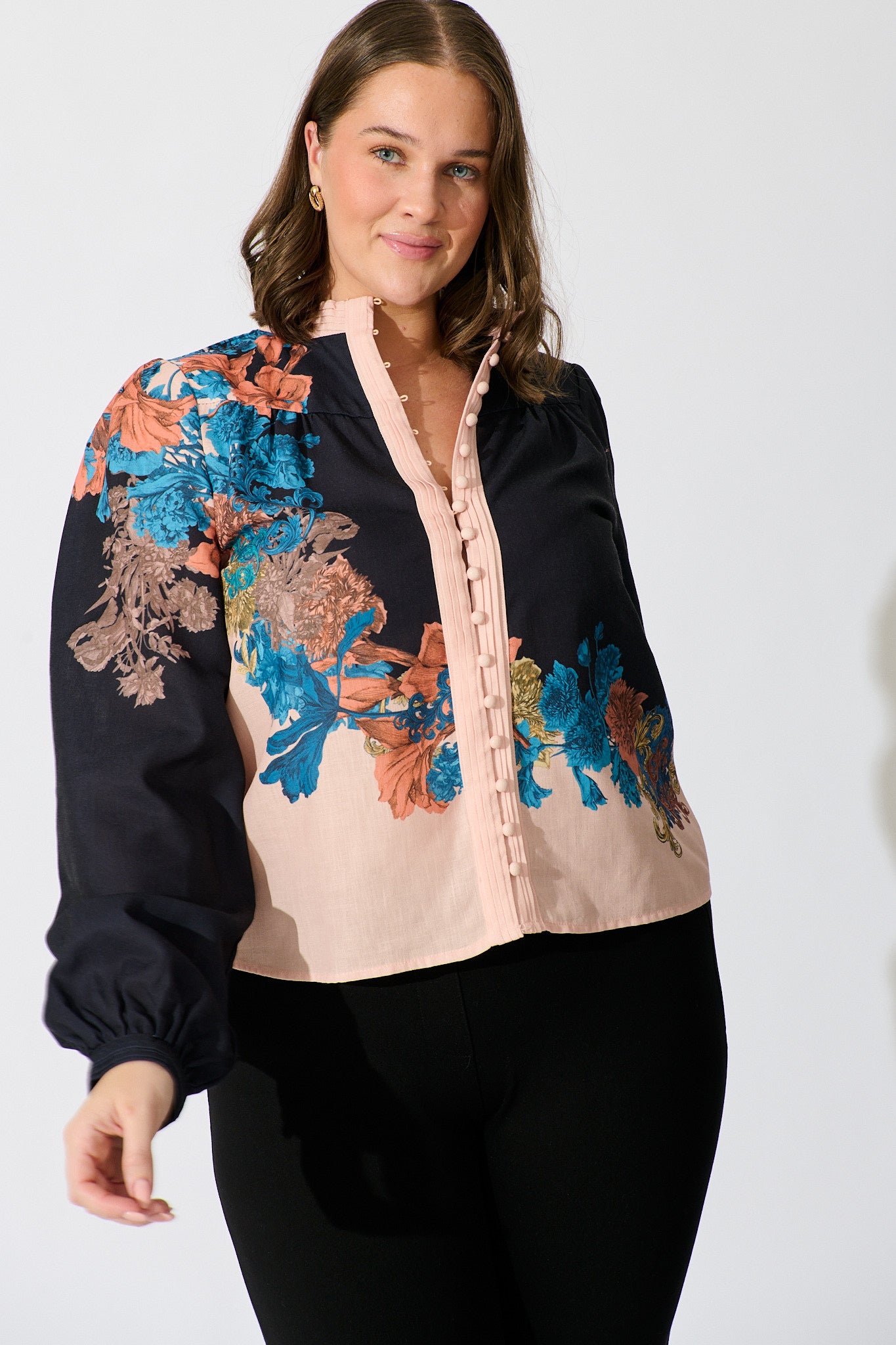 Secret Bloom Blouse Top in Black Multi Floral Linen Blend