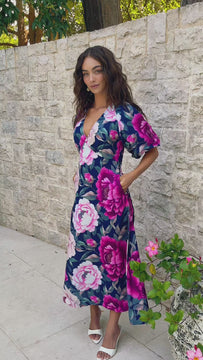 Crafted from a lightweight linen blend, this breathable fabric keeps you comfortable while maintaining a smooth, elevated finish. The navy base is beautifully complemented by a pink floral print, creating a timeless look with modern appeal. The fit and flare shape enhances your figure, flowing into a full maxi skirt that moves elegantly with every step.