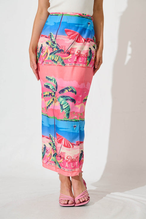 Seneca Wrap Skirt In Pink And Blue Tropical Print Linen Blend