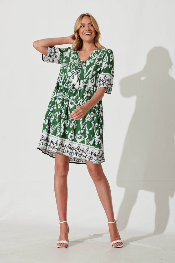 Shake It Out Smock Dress In Green And Cream Aztec Print