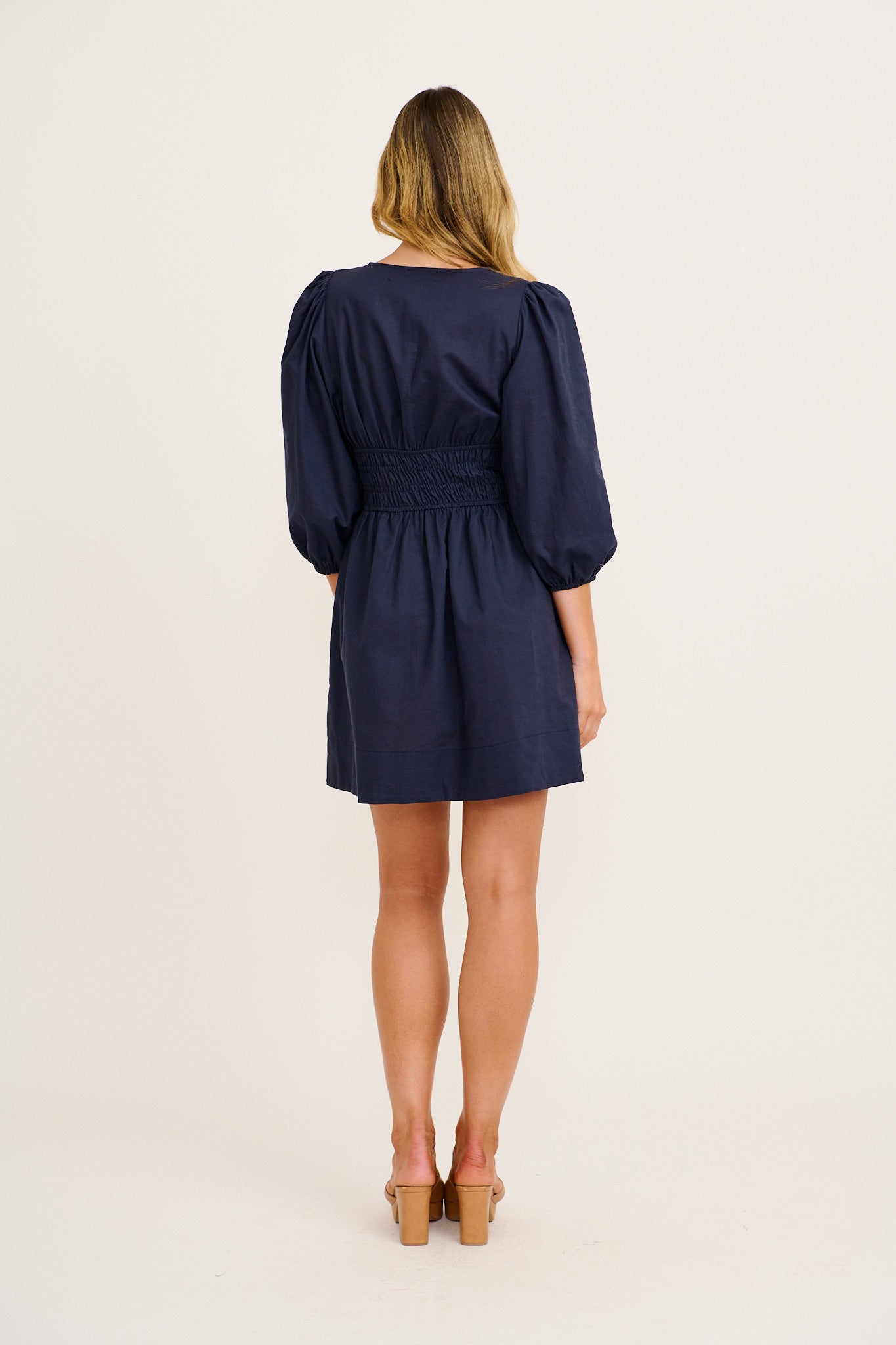 Crafted from a lightweight cotton-linen blend, this non-stretch mini features a flattering V-neckline, puff 3/4 sleeves with elasticised cuffs, and a softly shirred waist that adds definition without restriction. The breathable fabric makes it perfect for warm weather, while the above-the-knee cut keeps it casual yet refined.