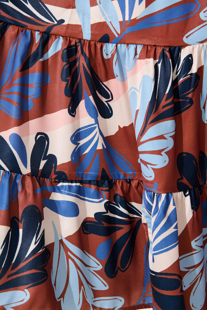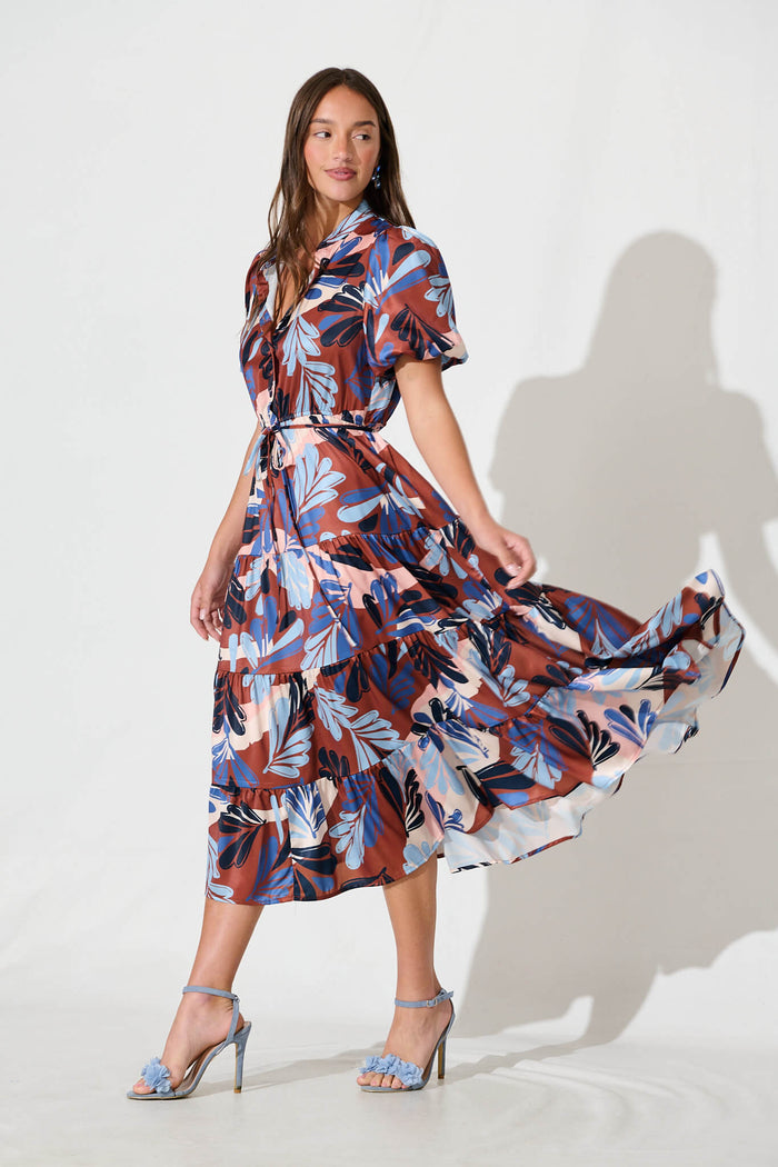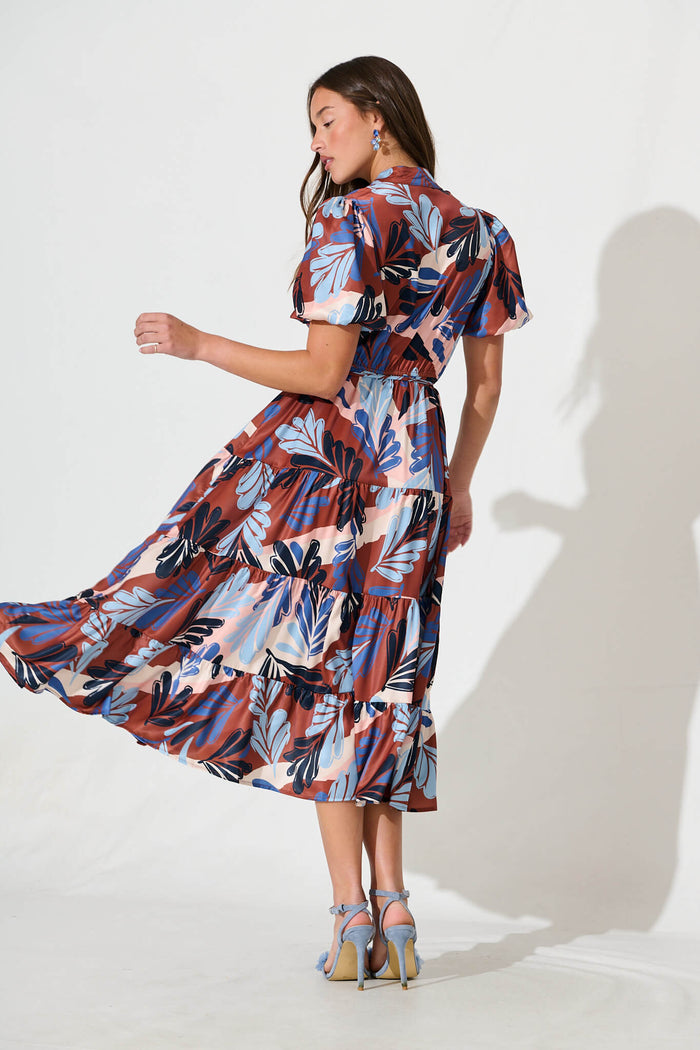 Sienna Midi Dress In Chocolate With Blue Multi Print Satin
