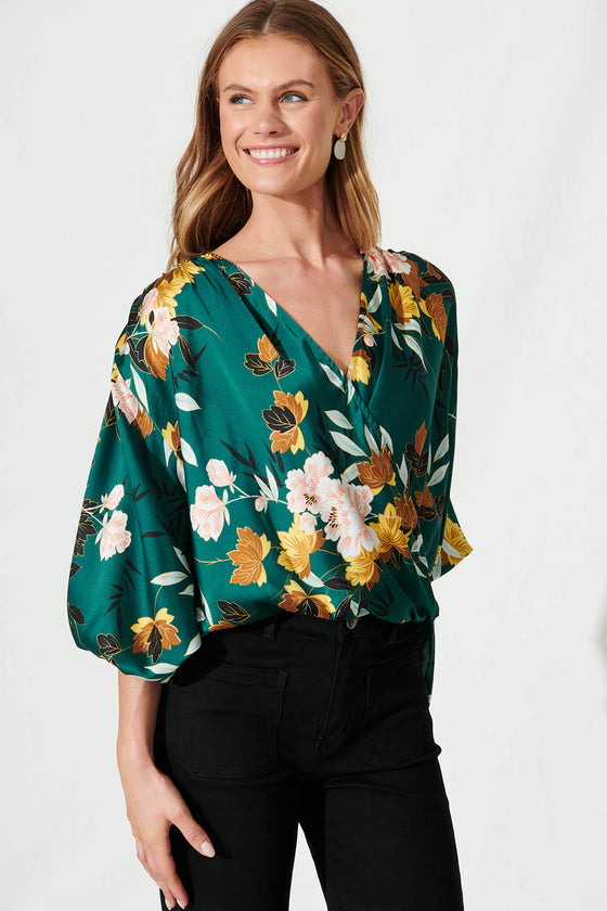 Solita Top In Emerald With Blush Floral Satin