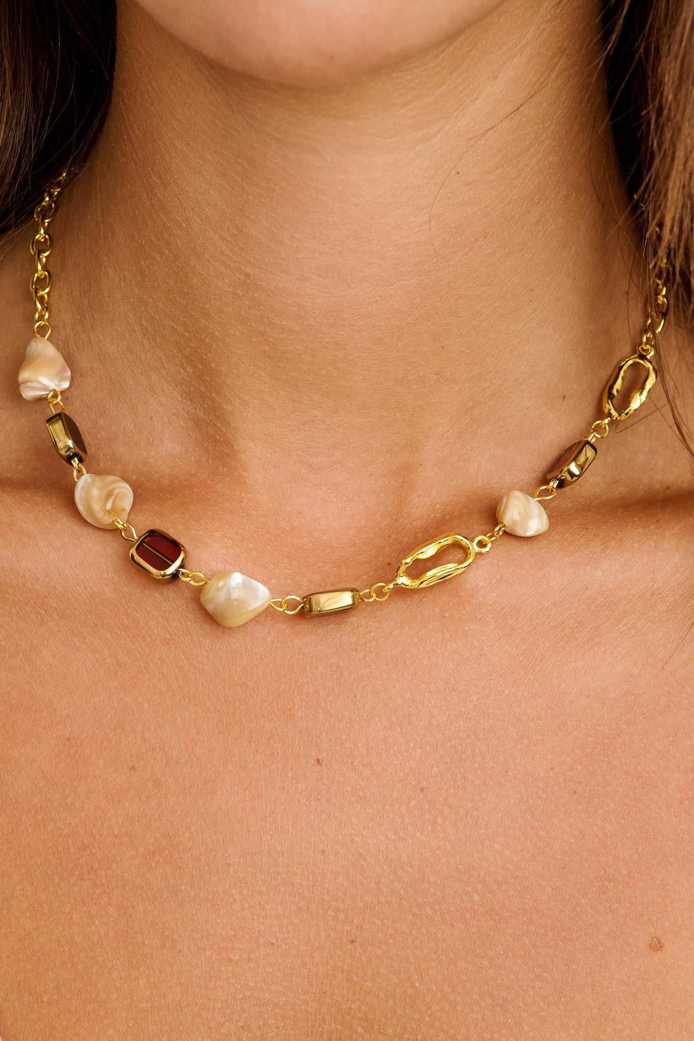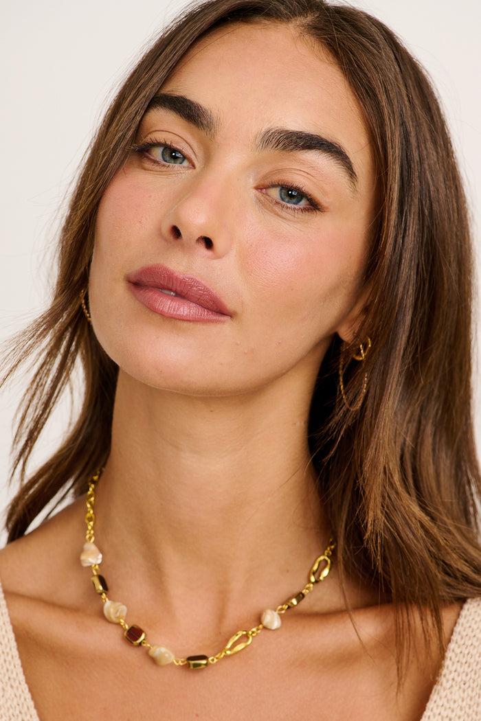 The subtle pop of amber resin gives it a nostalgic feel, while the crab claw clasp and adjustable length offer ease and versatility. Whether layered with other chains or worn alone with a linen shirt or satin cami, Soraya is a unique touch that completes the look.