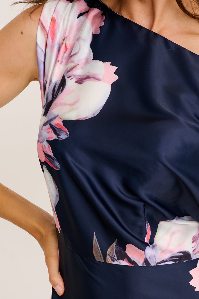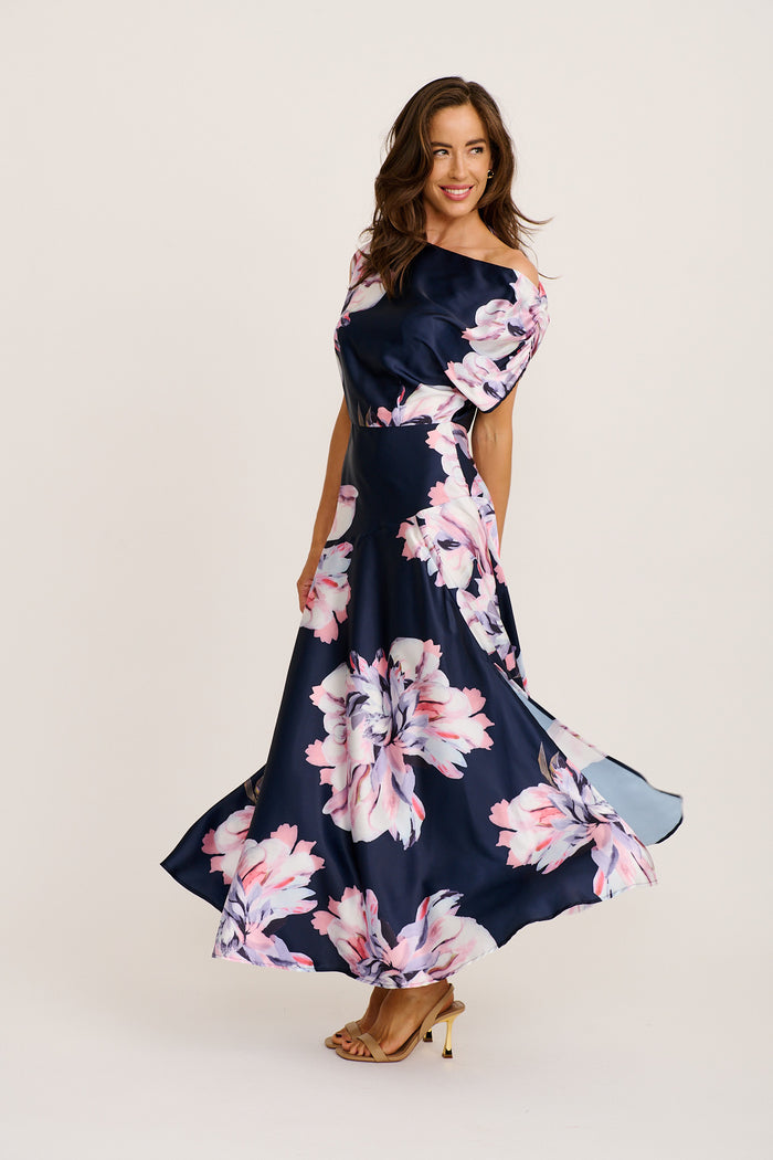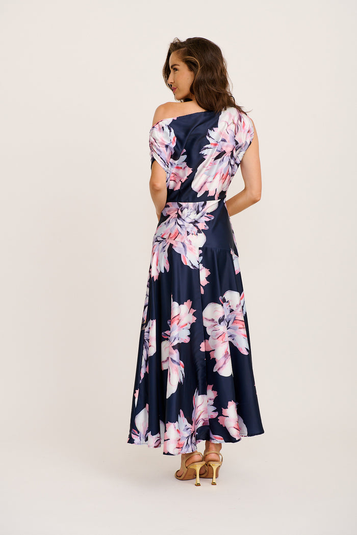 Spark Maxi Off Shoulder Dress in Navy Floral Satin