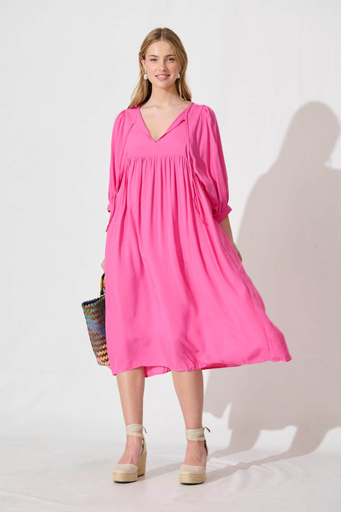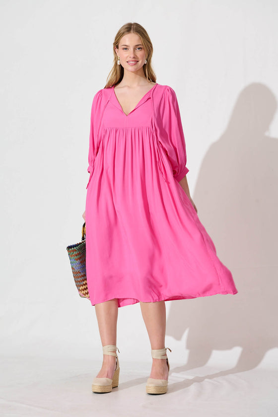 Spring Afternoon Midi Smock Dress In Hot Pink