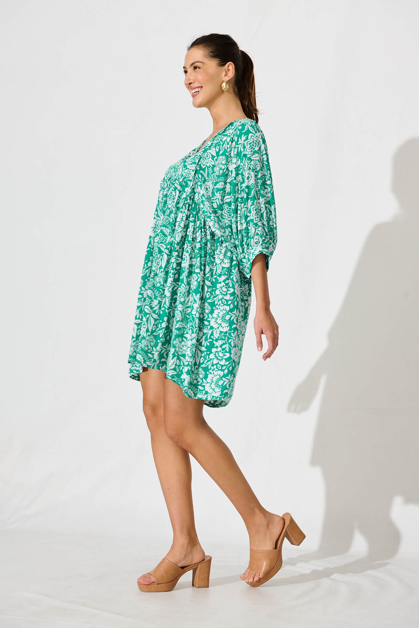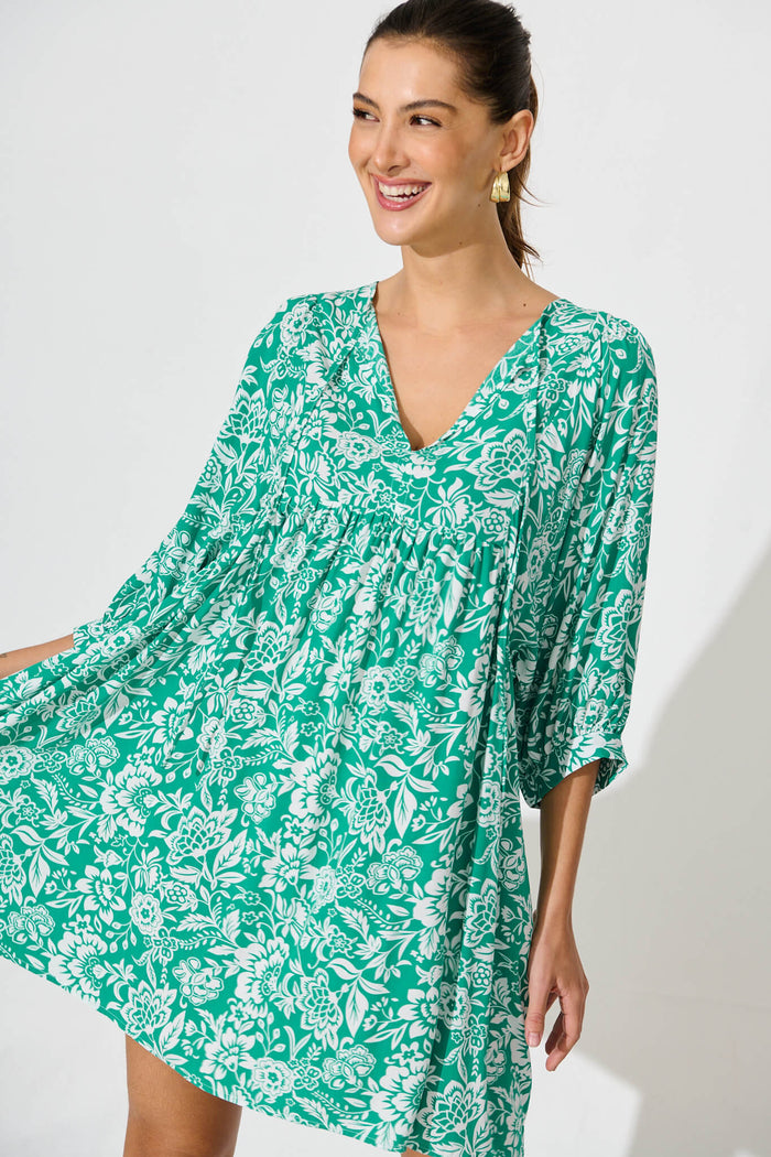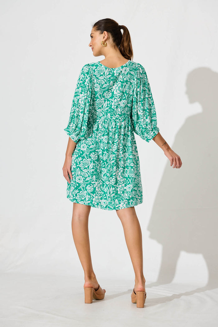 Spring Morning Smock Dress In Green With White Print