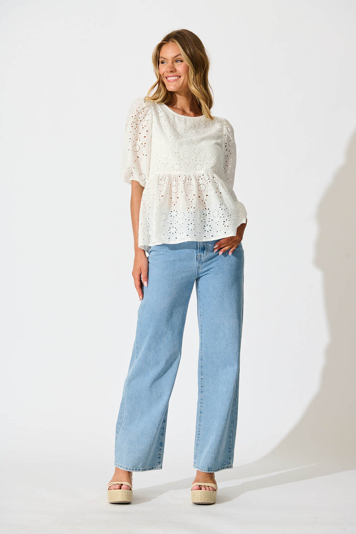 Feminine and fun, our Stacy Top will look gorgeous in the summer wardrobe. Featuring a cute broderie anglaise detailing, peplum waistline and a button neck opening. Team with your everyday denim and wedges for an effortless look.