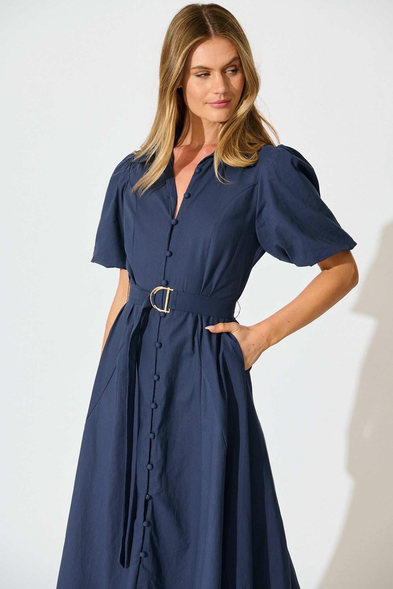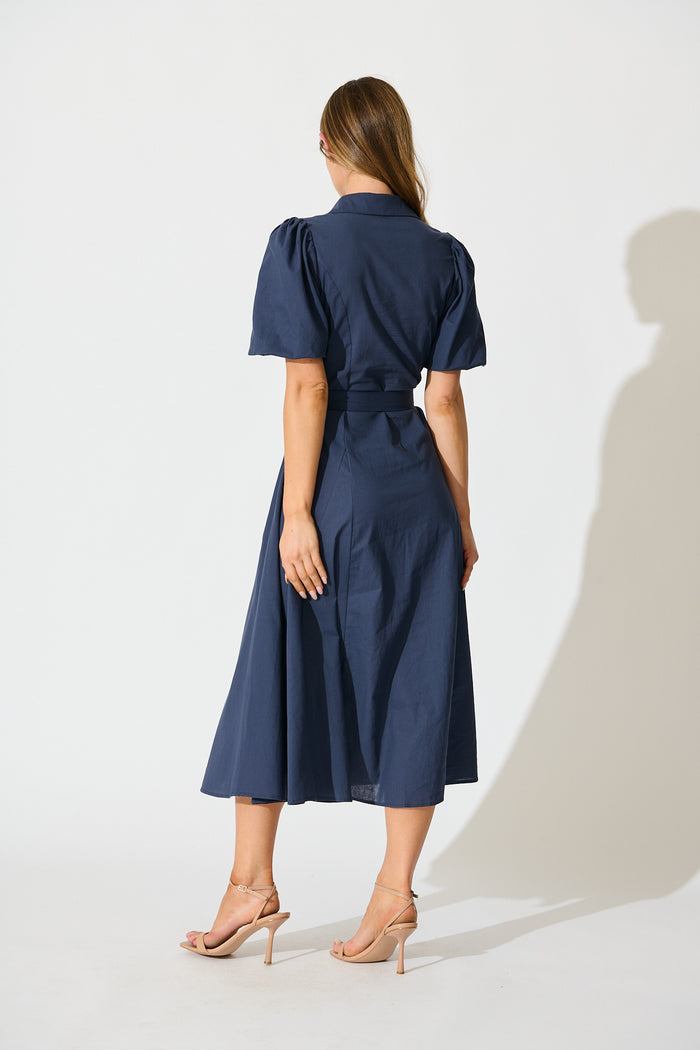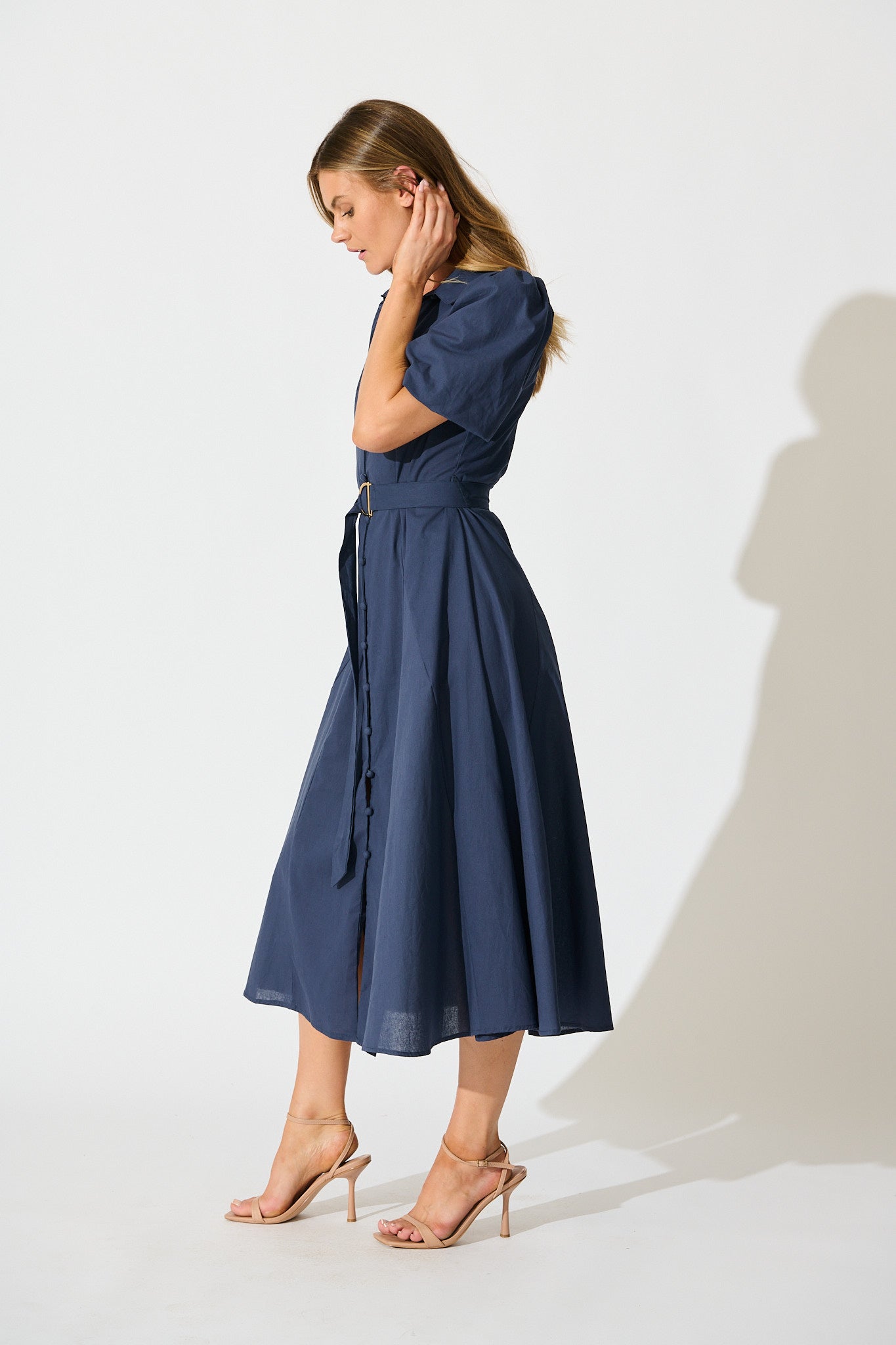 The Starlit Midi Shirt Dress in Navy Cotton offers a masterclass in refined simplicity. Rendered in breathable natural fibres, this piece balances tailored structure with relaxed ease. Its collared neckline and functional dome buttons evoke classic shirting, elevated by softly gathered puff sleeves and a cinched waistline that flatters with subtle definition.