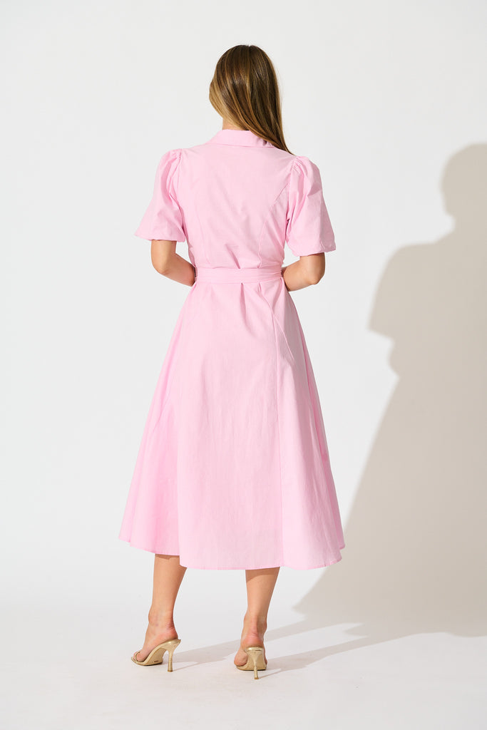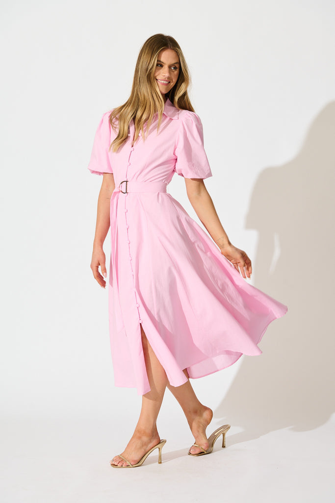 The Starlit Midi Shirt Dress in Pink Cotton reinterprets classic shirting through a lens of feminine charm. Crafted from crisp, breathable cotton, it boasts a refined silhouette framed by a structured collar, elasticised puff sleeves and a sculptural belt designed to cinch and shape the waistline with elegance.