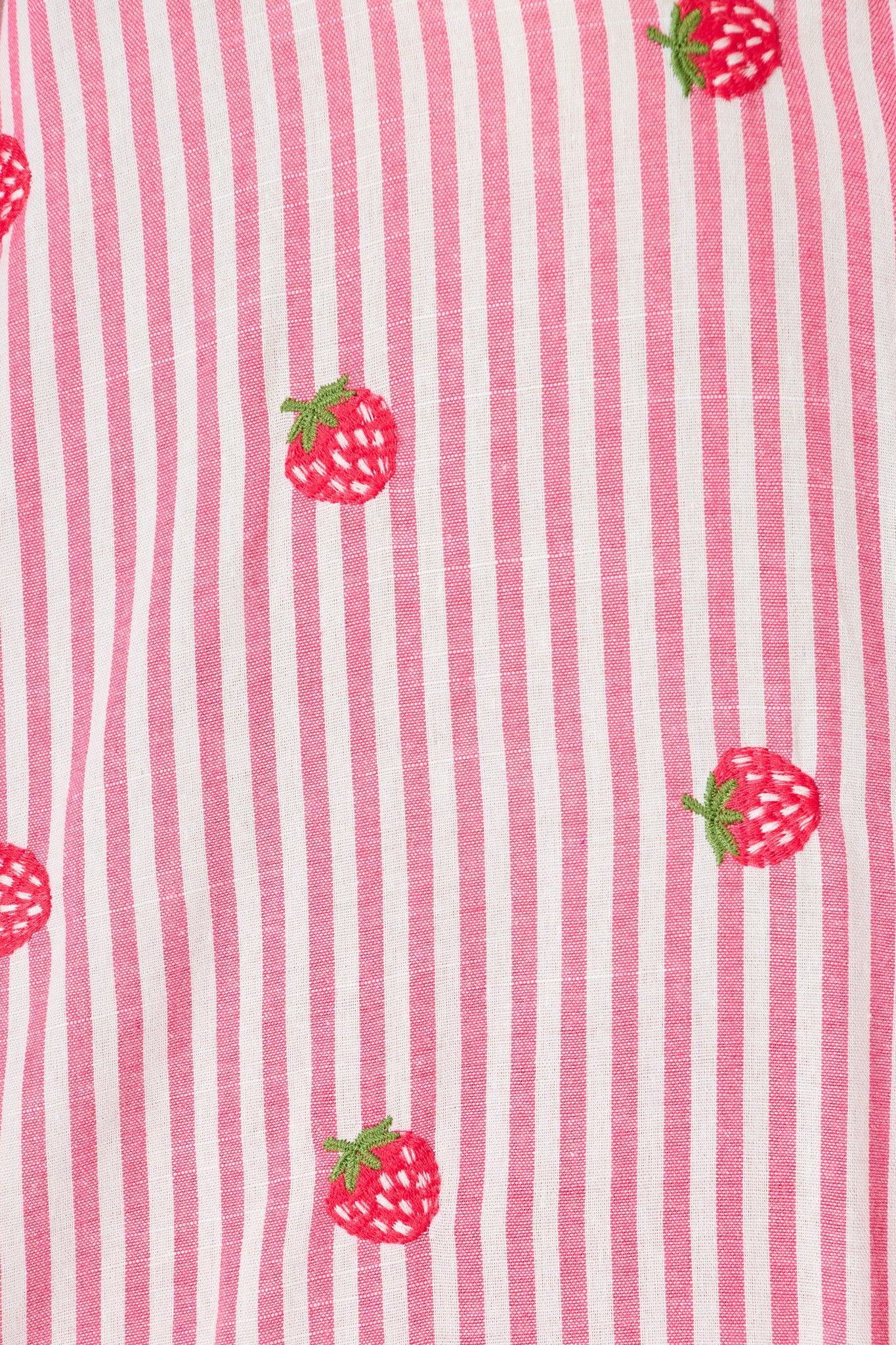 - Strawberry embroidery and pink stripe pattern for playful flair