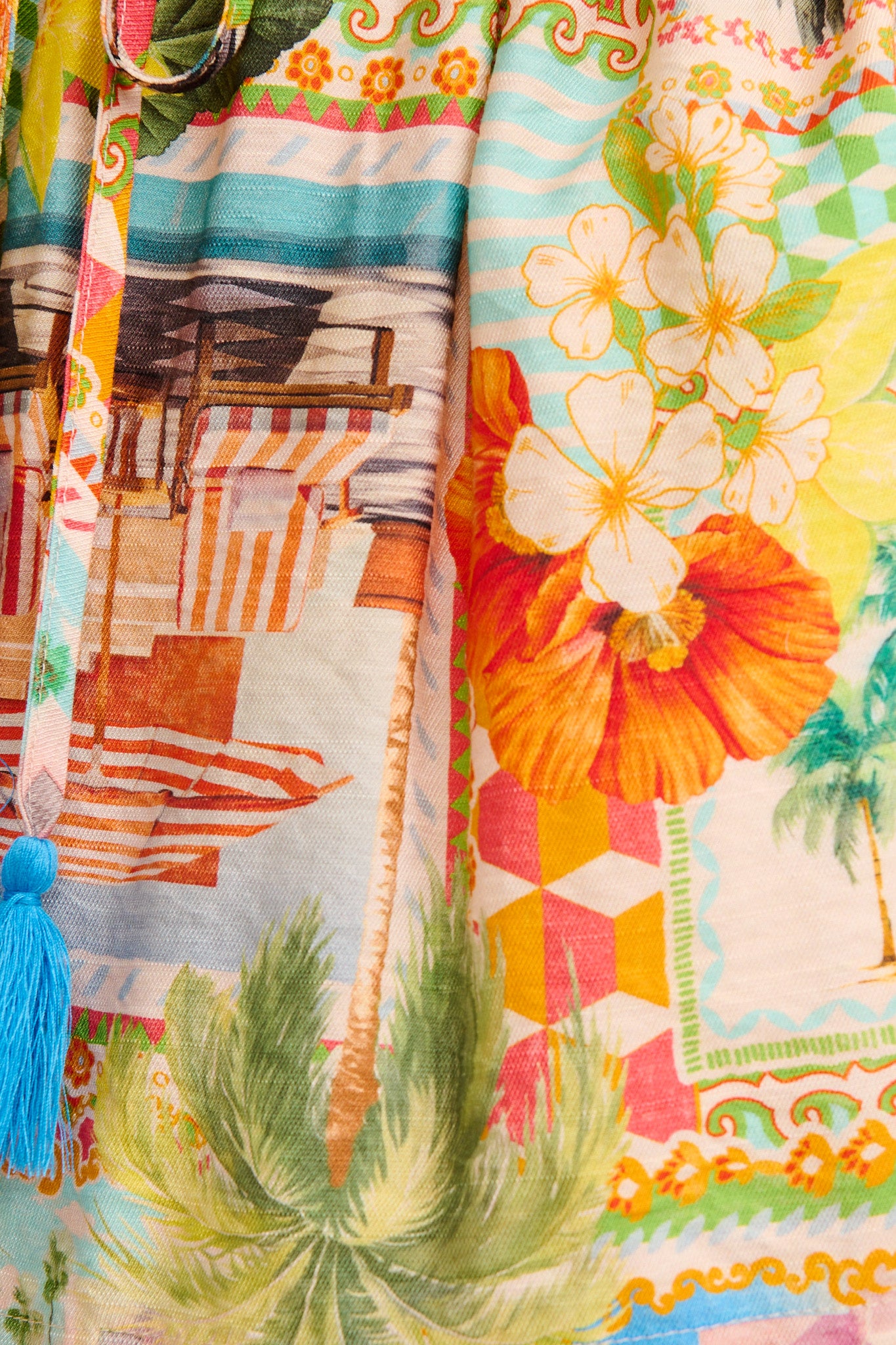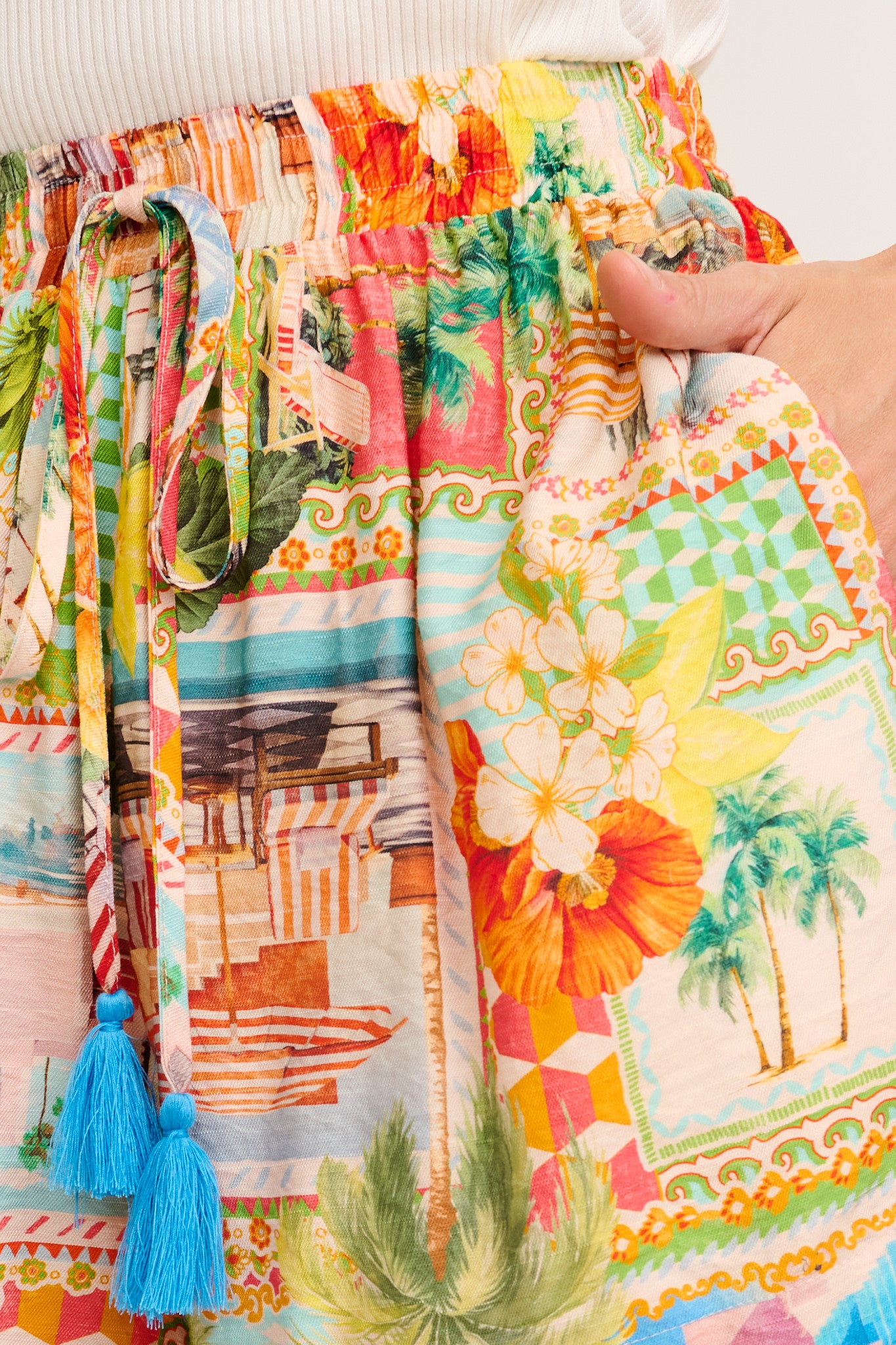 Crafted from a lightweight, breathable rayon fabric, they feature an encased elastic waistband and a functional drawstring with tassels for a comfy, adjustable fit. The relaxed shape and functional side pockets make them super wearable, while the postcard-inspired print adds just the right amount of whimsy.