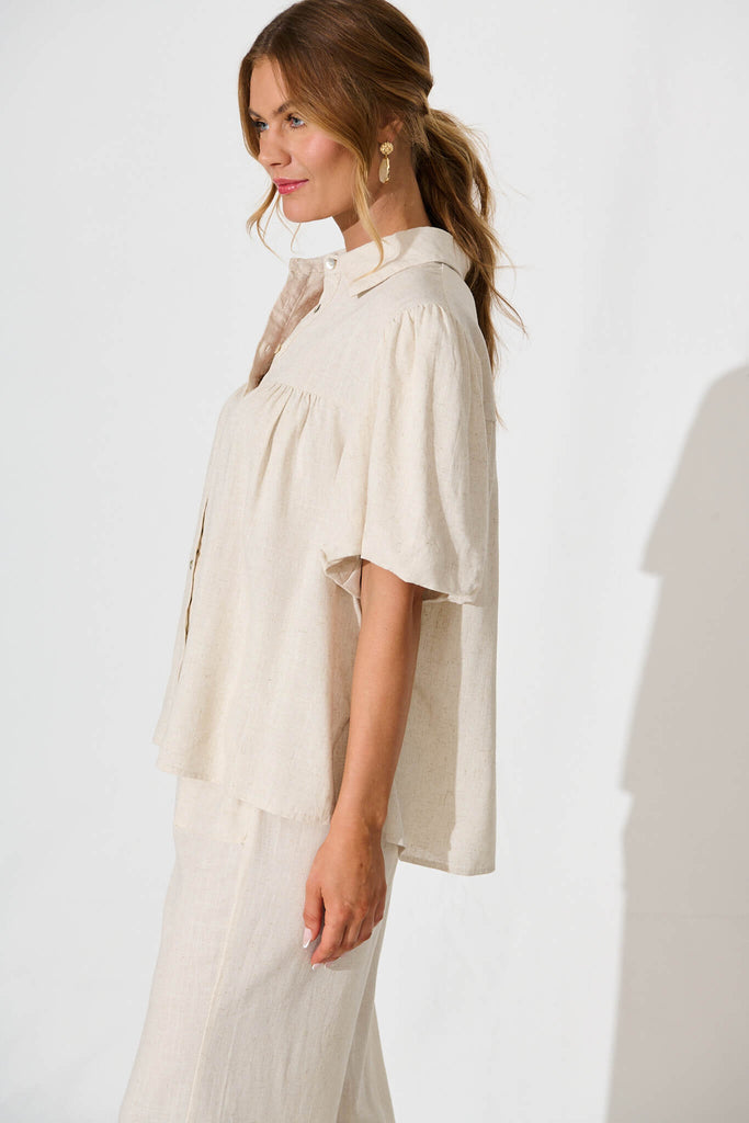Elevate your tops wardrobe this season with our Sunniva Shirt. Made from a cotton linen blend, features include a button down front with shell buttons and a striking collar. Team with your go-to palazzo pants and chunky heels for a chic look.